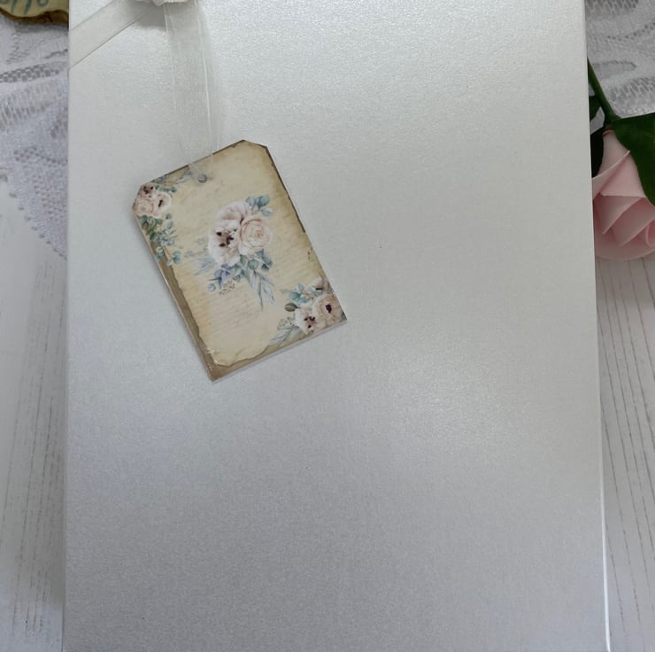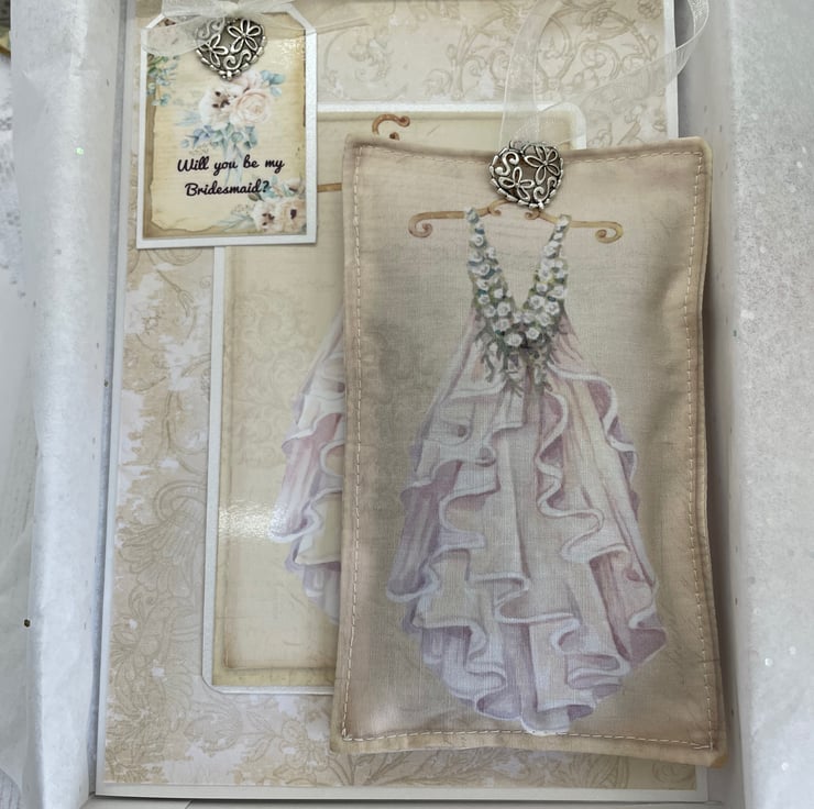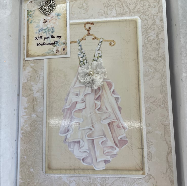 Vintage style card in muted tones. Pearl card and box. Bridal dress on the front, flowers and a tag reading ‘Will you be my Bridesmaid’