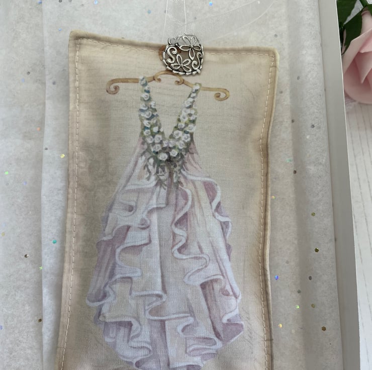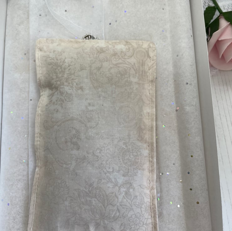 Cotton printed lavender sachet, the same design as the card. Silver heart charm on an organza ivory bow for hanging.