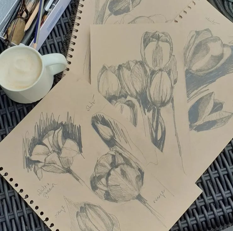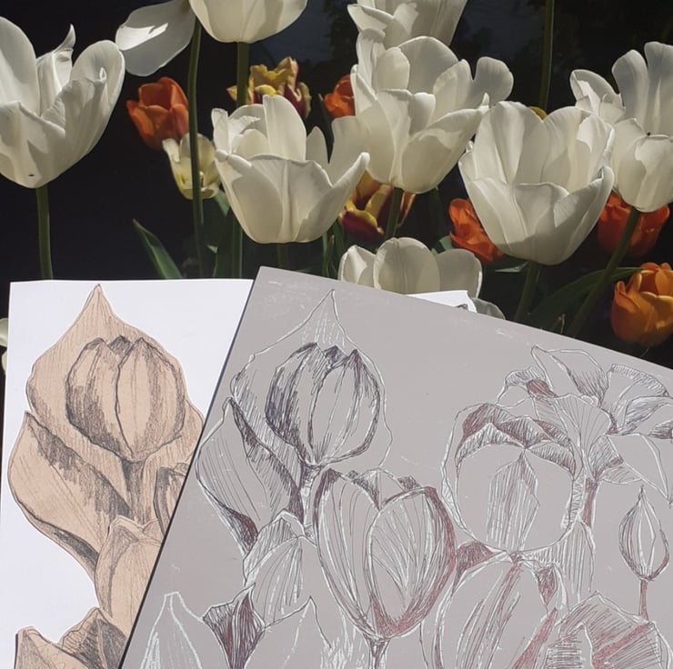 On from ‘The Promise of Tulips’, where the lush green foliage was celebrated, this print depicts what happened next, showing our glorious tulips in full bloom. I sketched the differing shapes of each variety but chose to reproduce all of the flowers in the stunning orange.