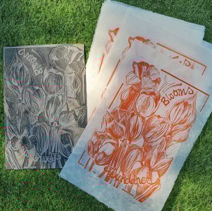 'Spring Tulips', Lino Print in Orange on Natural Lokta Paper