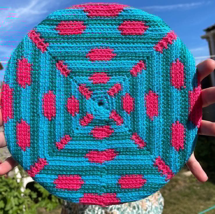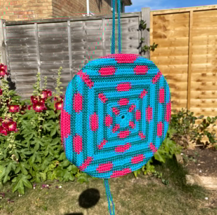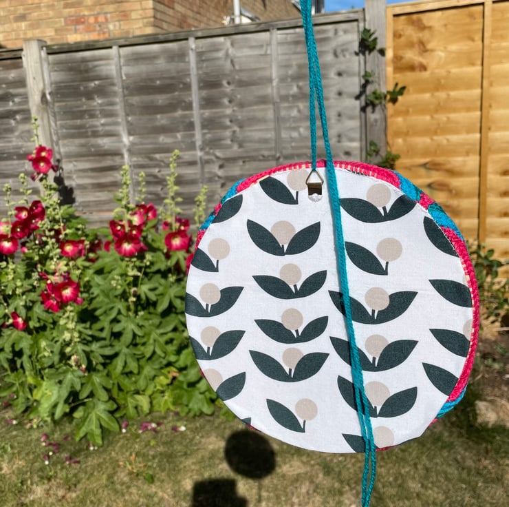 This crochet item has been sewn to a 20cm diameter hoop. I’ve then added a material covered, card backing with hanging hook.