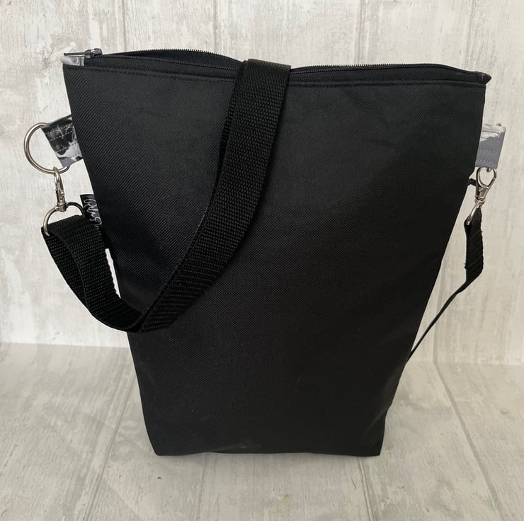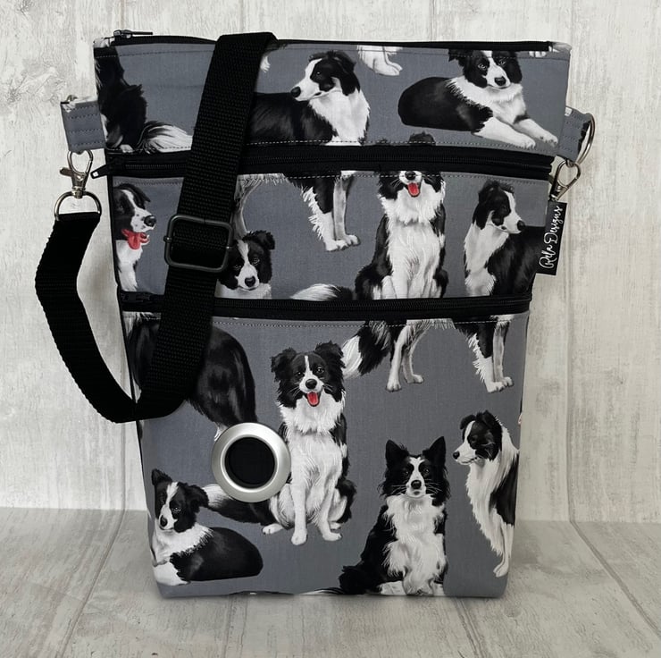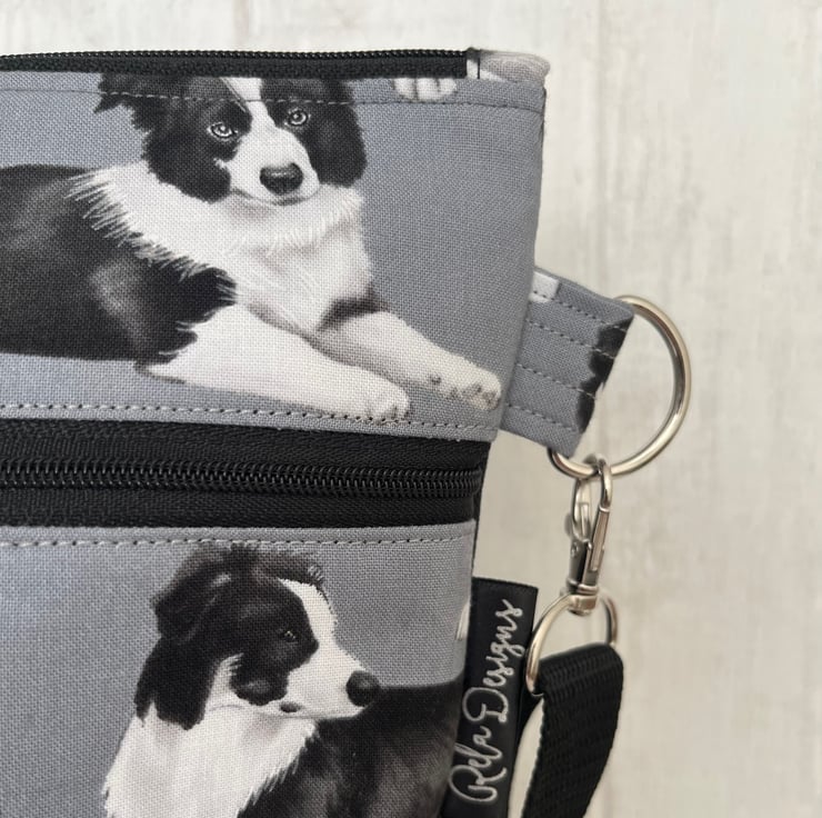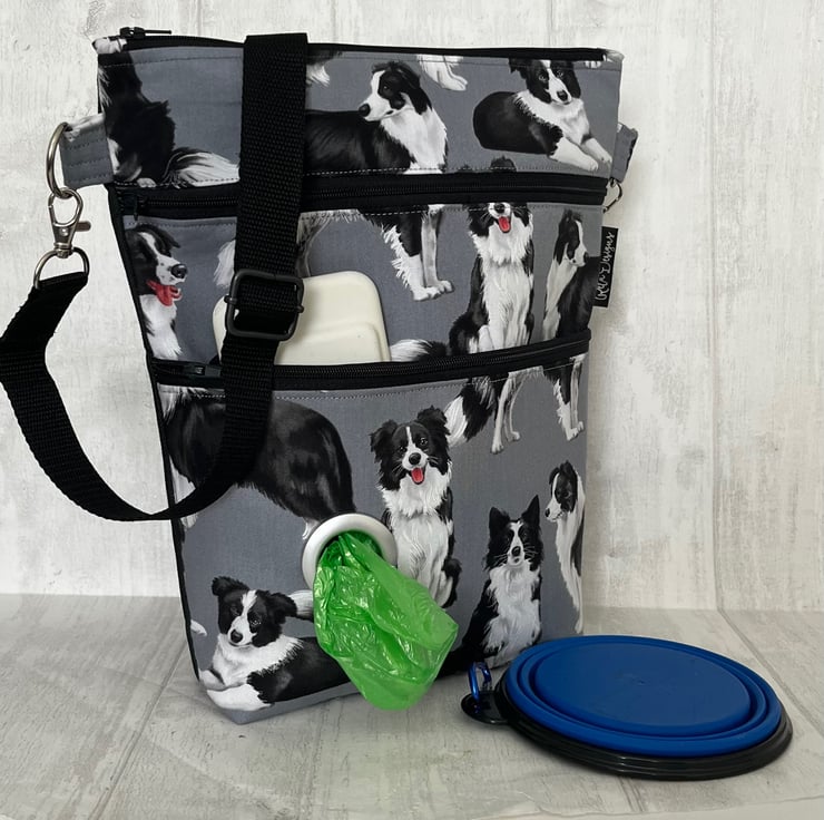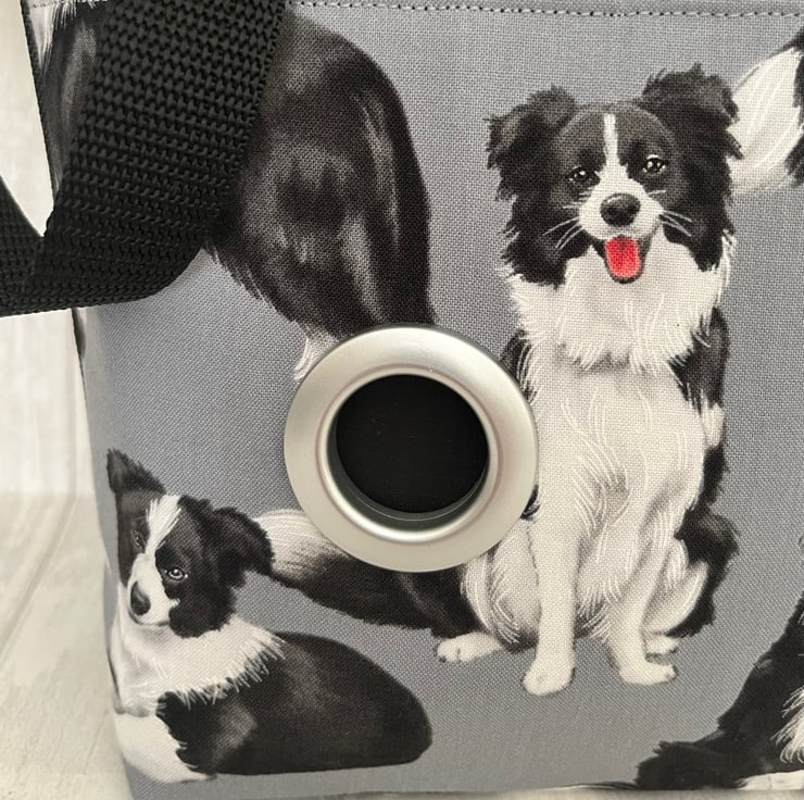 This border collie cotton print cross body dog walking bag has a plain black waterproof nylon canvas back and is lined with a black waterproof nylon lining. This handy bag will hold all your essentials for walking your dog.