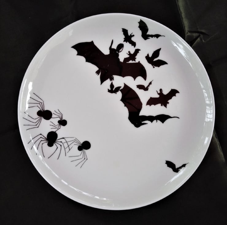 Bats and bats and spiders. A flock of black flying bats and a swarm of spiders on a large pure white bone china dinner plate, ten and a half inches across. It is one of a range of bat and spider items designed by Gitte Gibbons. They are hand decorated at her studio in South Wiltshire.