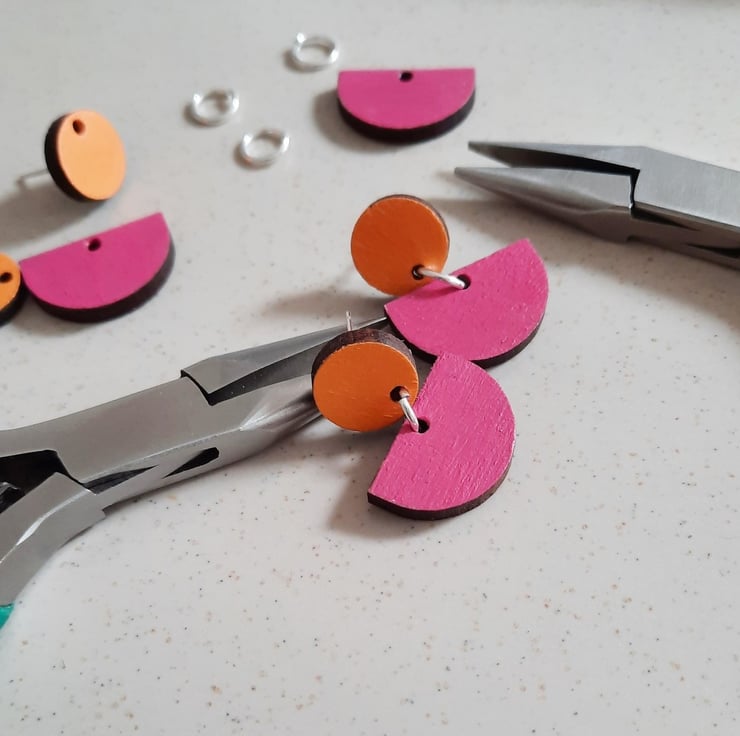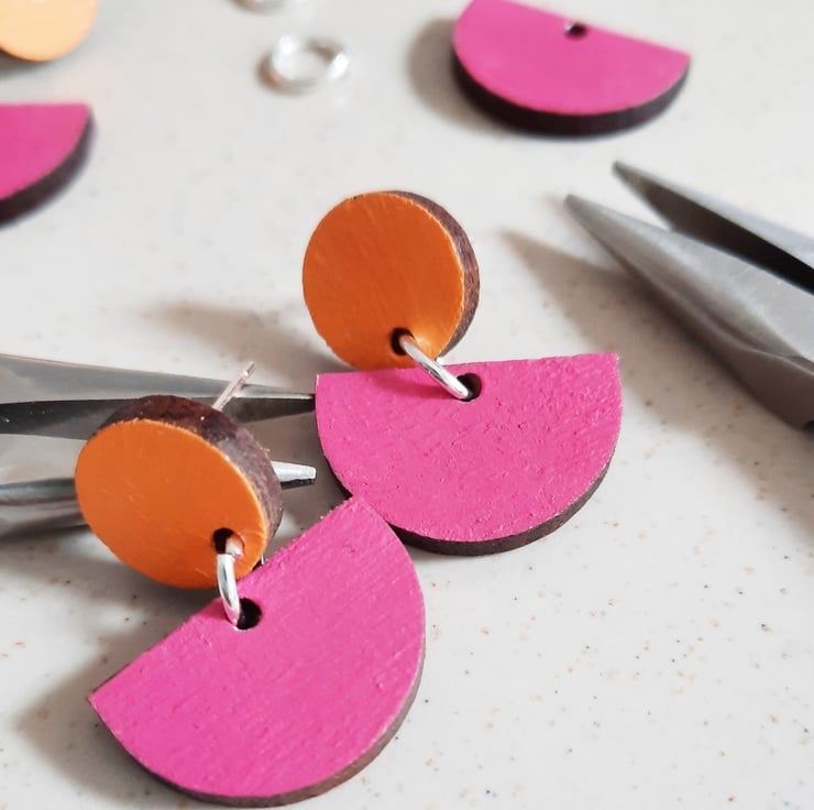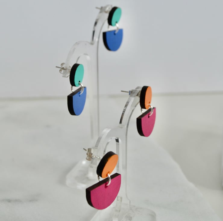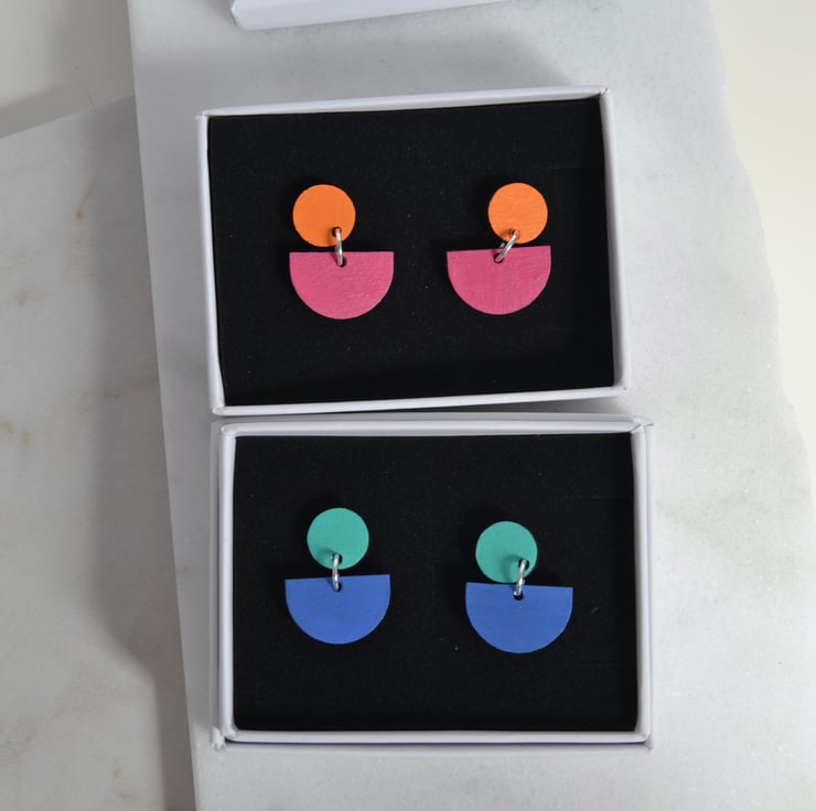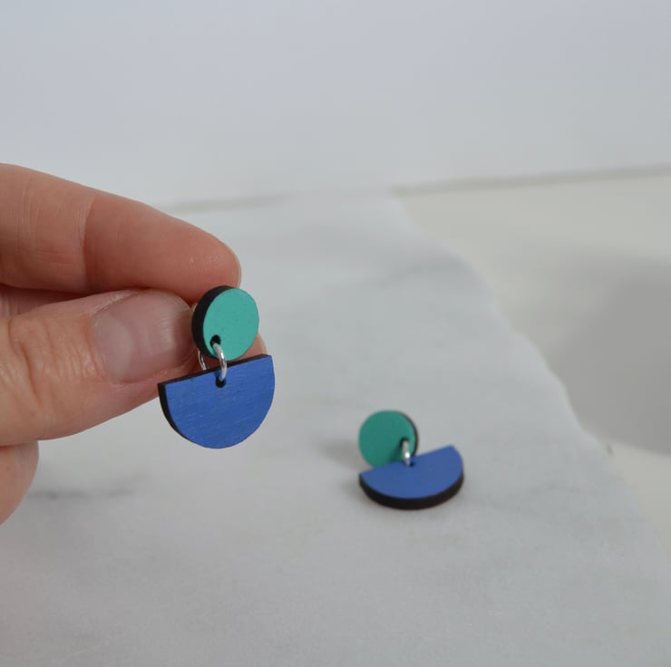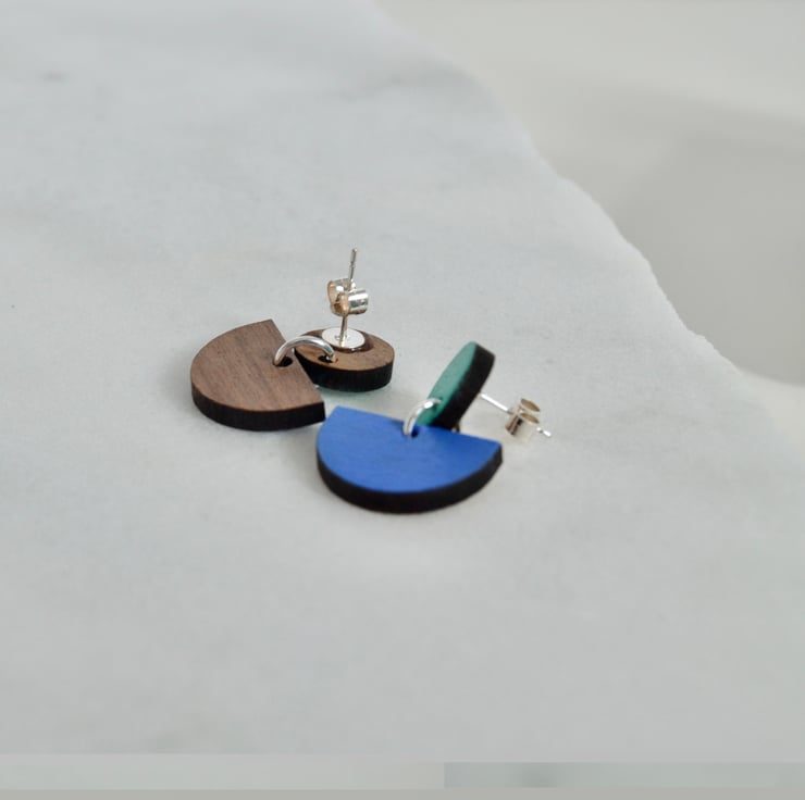 Colour pop wooden stud earrings. These colourful earrings fasten with a post and butterfly. The top part is a circle, with a semi-circle suspended from it. The two parts are both made from walnut wood, which I have lasercut for me. They are then handpainted and varnished. The back is left the natural walnut colour. The edges are dark from the lasercutting process, which gives a nice contrast.