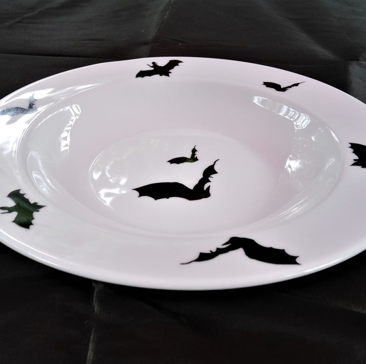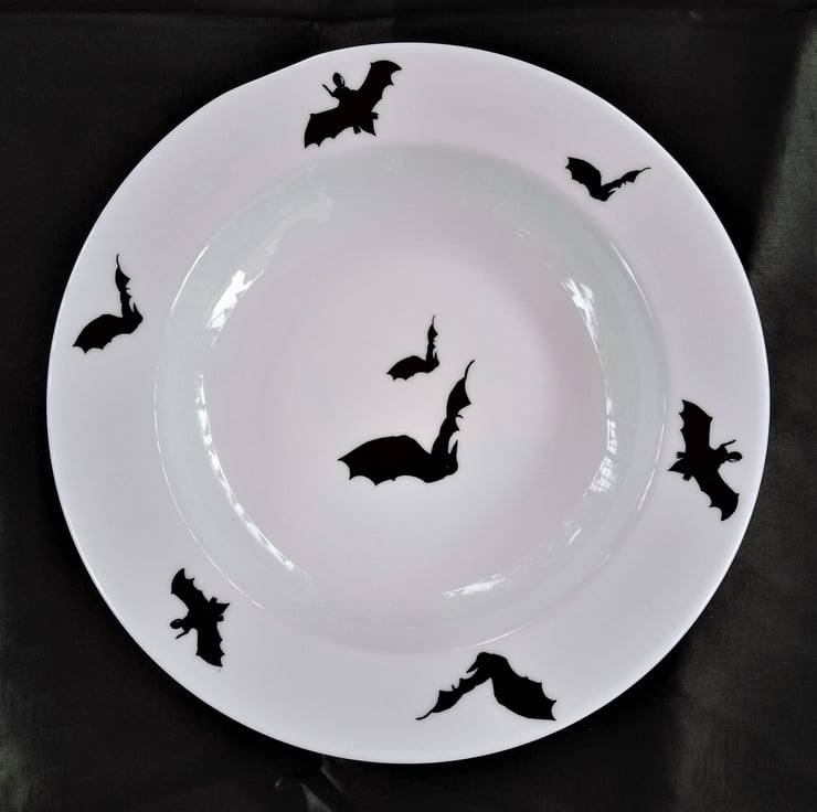 Bats and bats and more bats. A flock of black flying bats on a pure white bone china pasta or soup bowl. It is nine inches wide and is one of a range of bat and spider items designed by Gitte Gibbons. They are hand decorated at her studio in South Wiltshire and has her name and logo underneath.