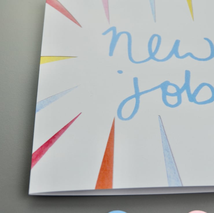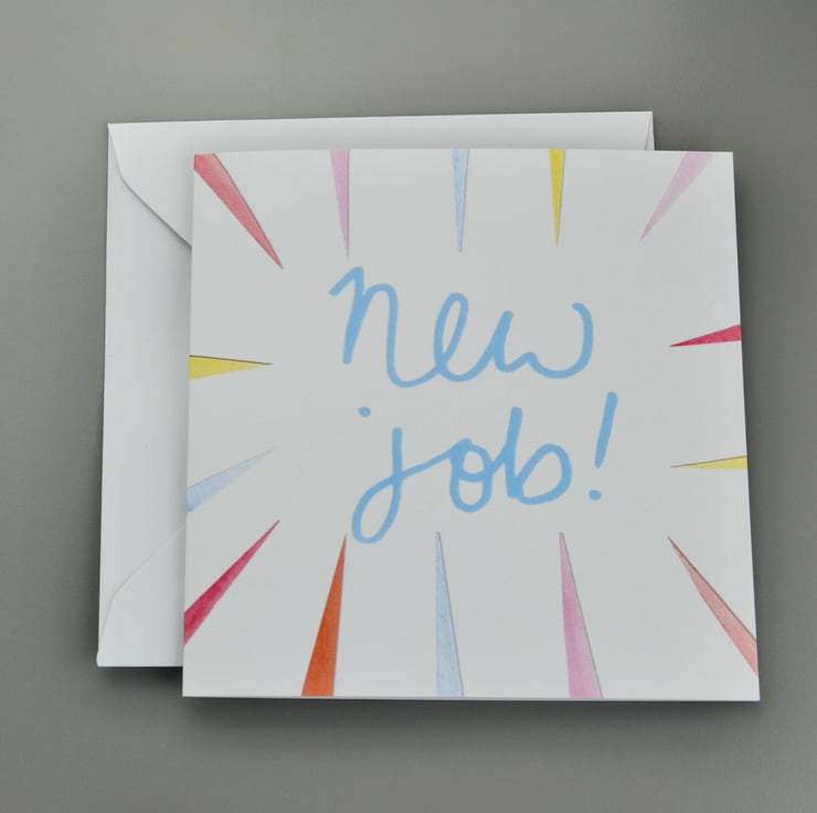 This new job card has a white background with light blue hand lettering saying 'new job!'. There's a starburst design made from handpainted paper triangles. The original design was completely handmade and was then digitally reproduced.