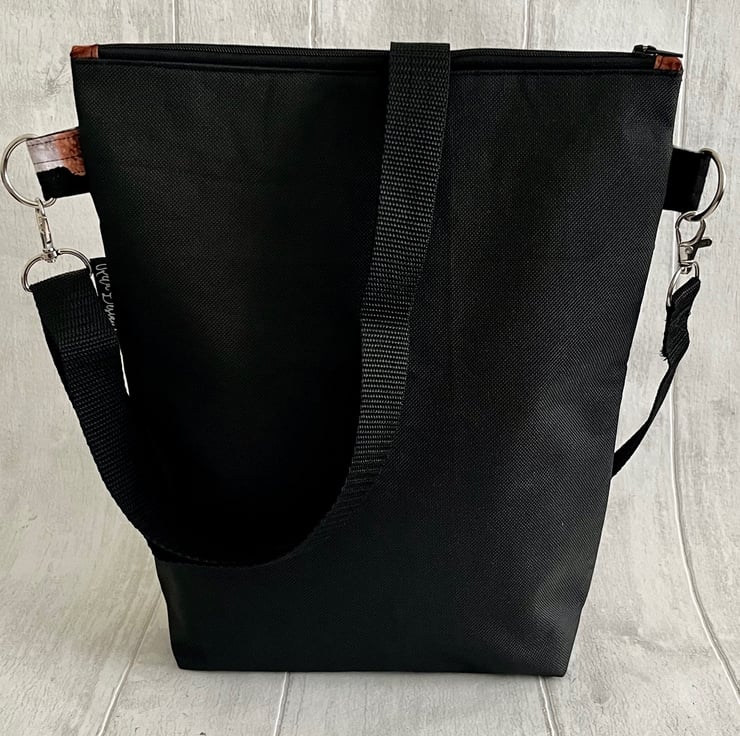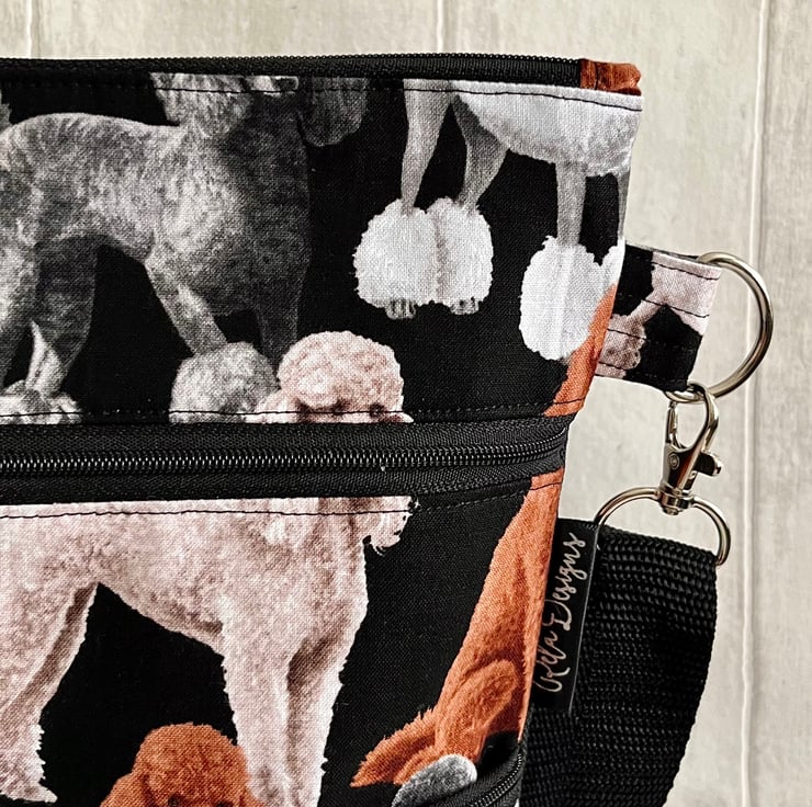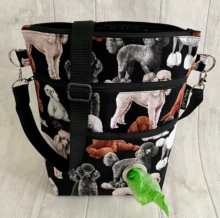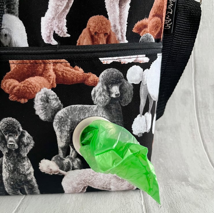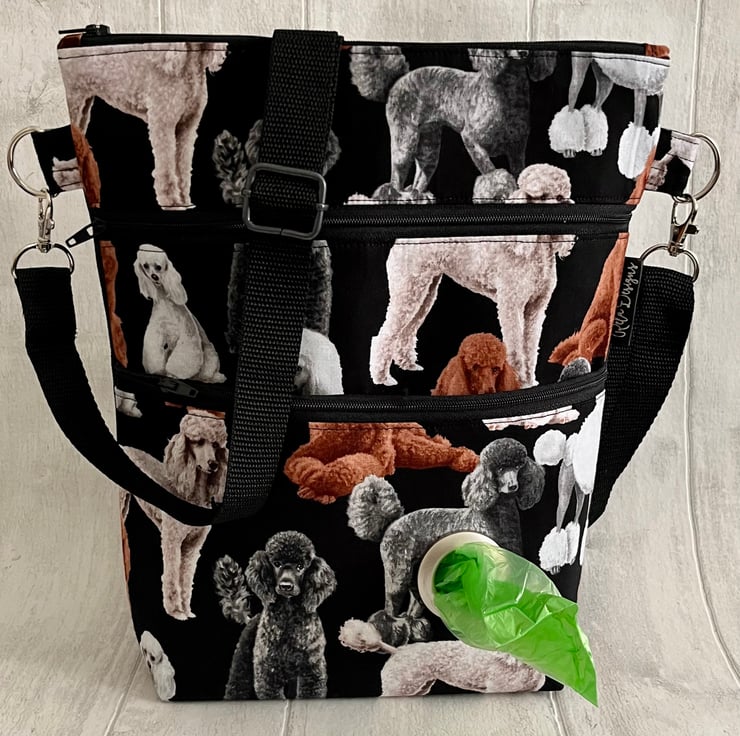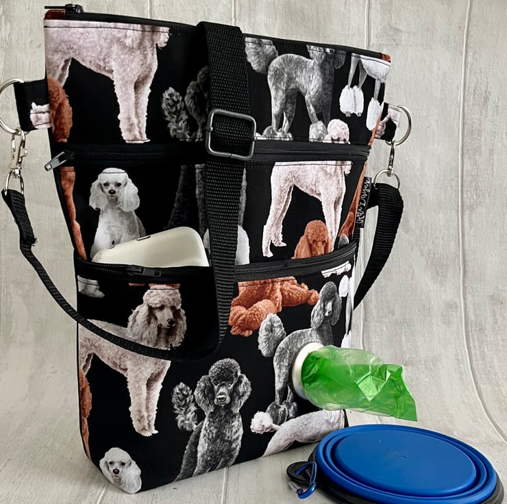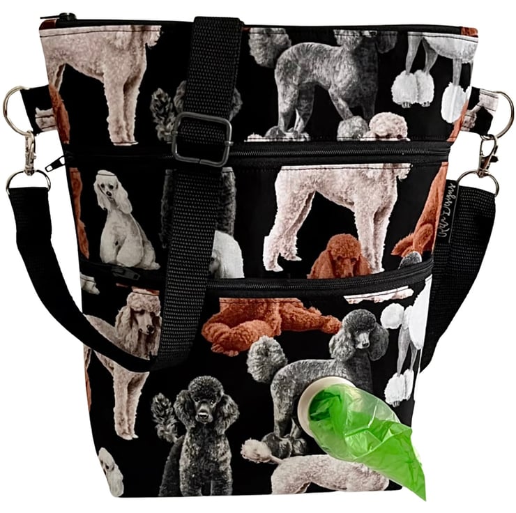 This giant poodle cotton print cross body dog walking bag has a plain black waterproof nylon canvas back and is lined with a black waterproof nylon lining. This handy bag will hold all your essentials for walking your dog.