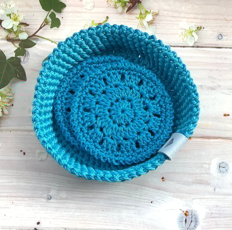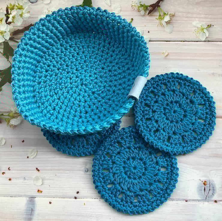 I used a different brand of yarn for the basket to make it as sturdy as possible, the shade of turquoise is lighter than the coasters but nevertheless they go together well.