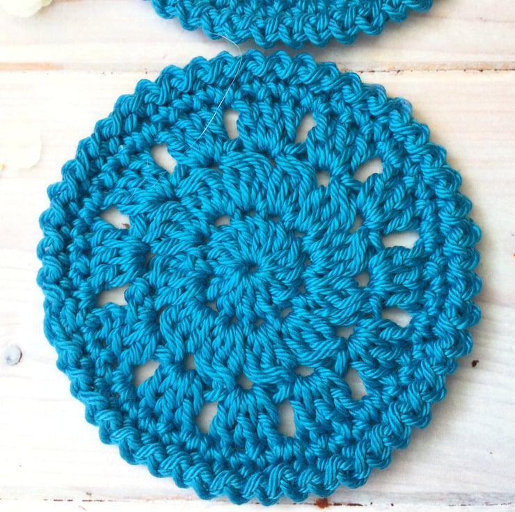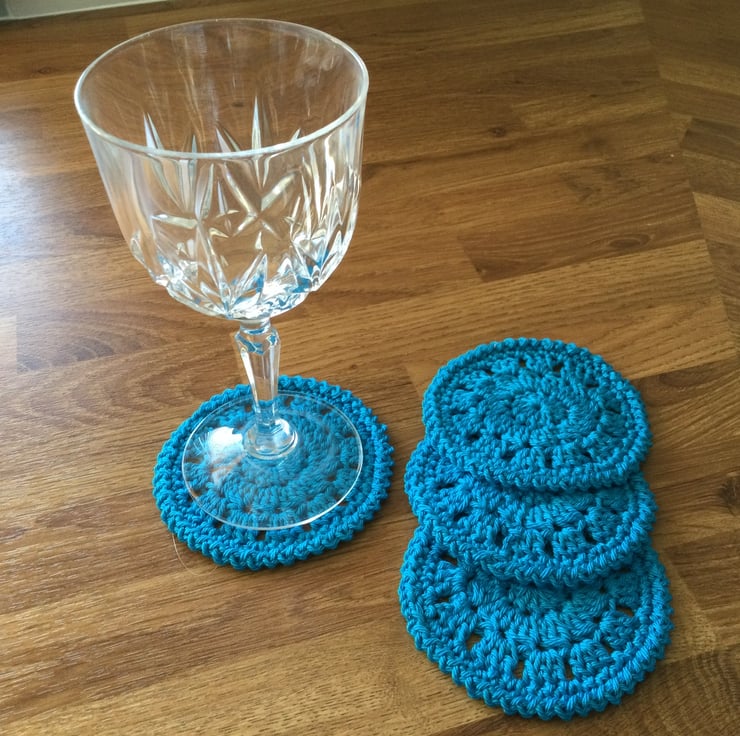 I have crocheted this set of coasters using a 100% cotton yarn in a gorgeous shade of turquoise blue.