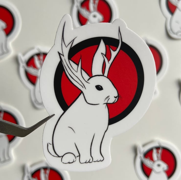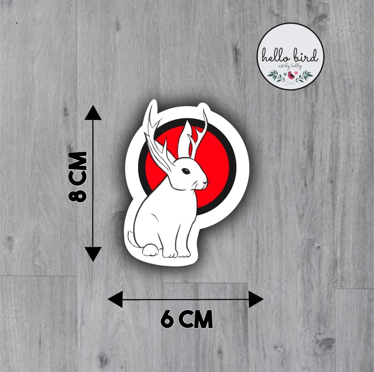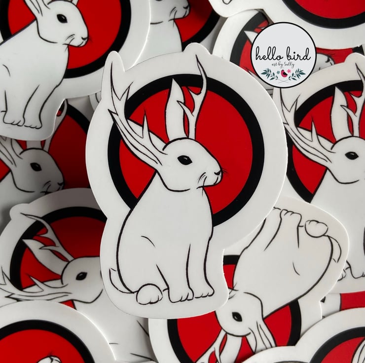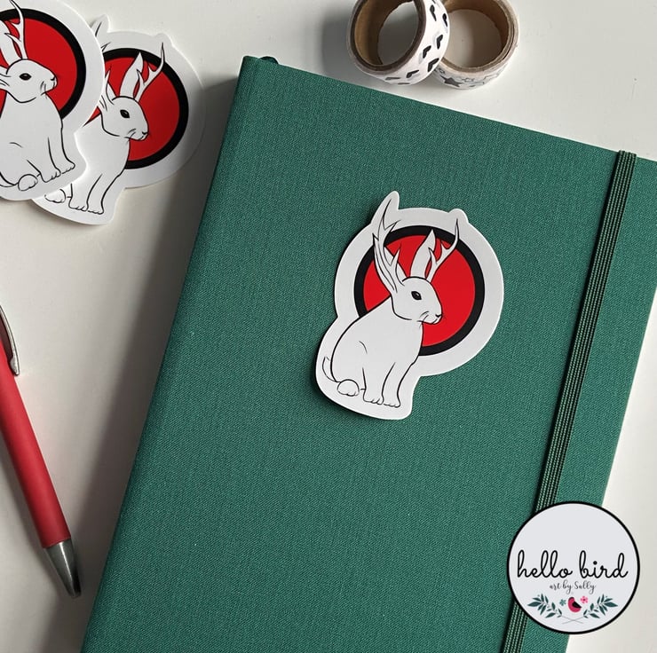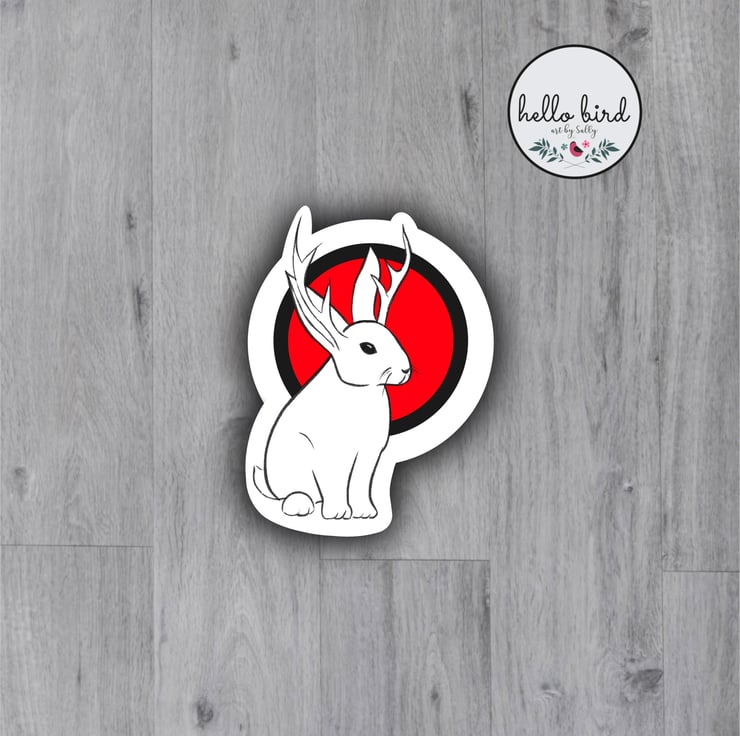Original design vinyl sticker featuring the mythical animal the jackalope (also known as a jackrabbit). This adorable creature is often associated with good luck. Digitally hand-drawn by me and created with crisp, bold colours and lines.