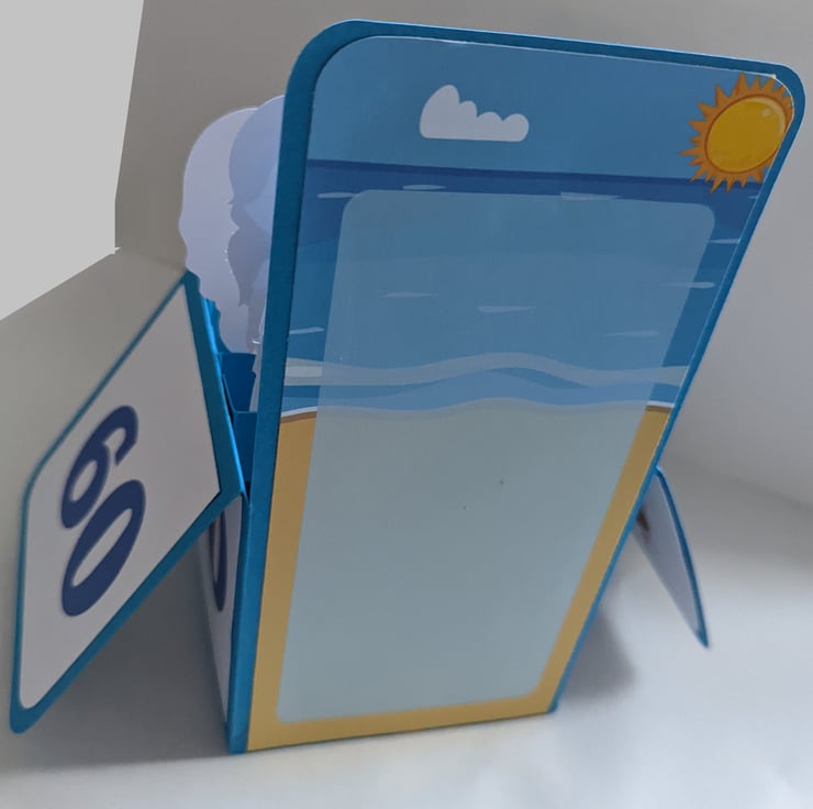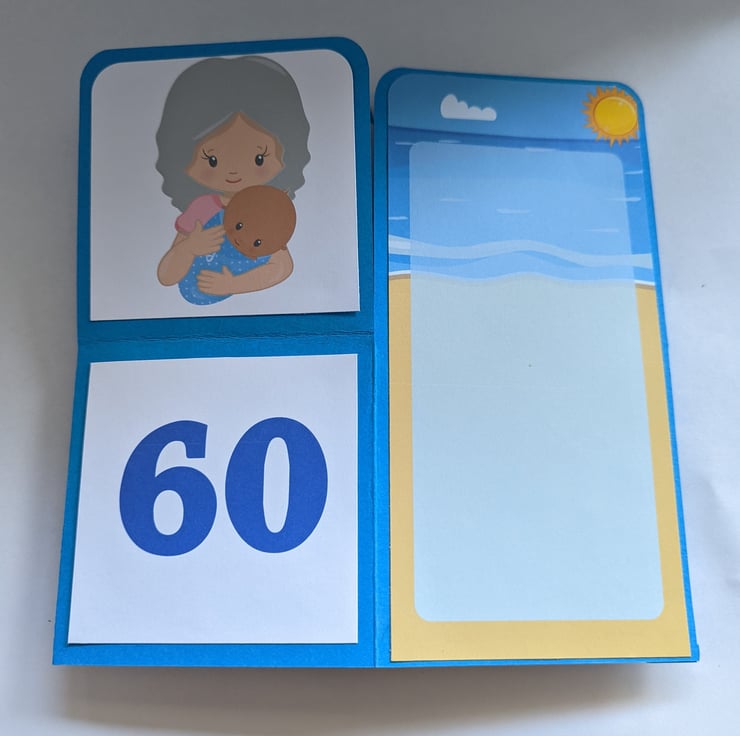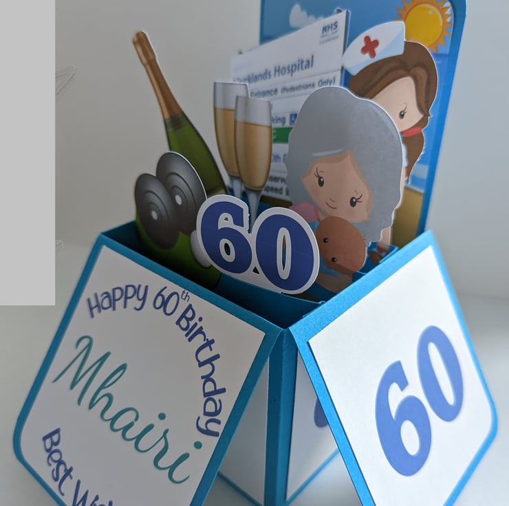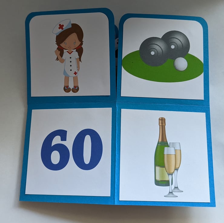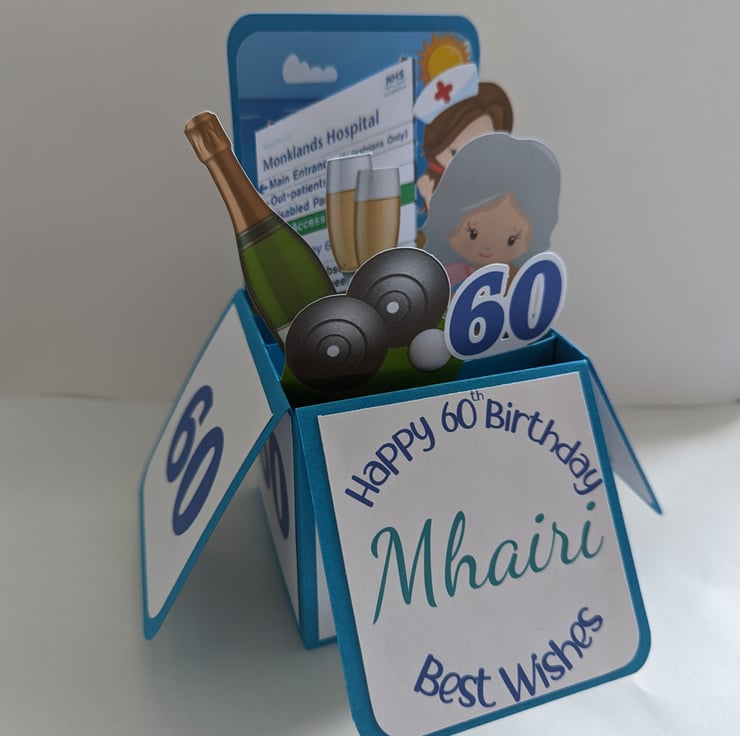 A lovely large box card full of the recipients favourite things, grandchildren, nursing, bowls, sparkly wine and going to the beach. The card has a blue base with favourite things images on each panel along with some 60's. The front of the card reads Happy Birthday Mhairi, this will be changed to a message of your choice and the card will be filled with images of your choosing. (Sorry no copyright images).