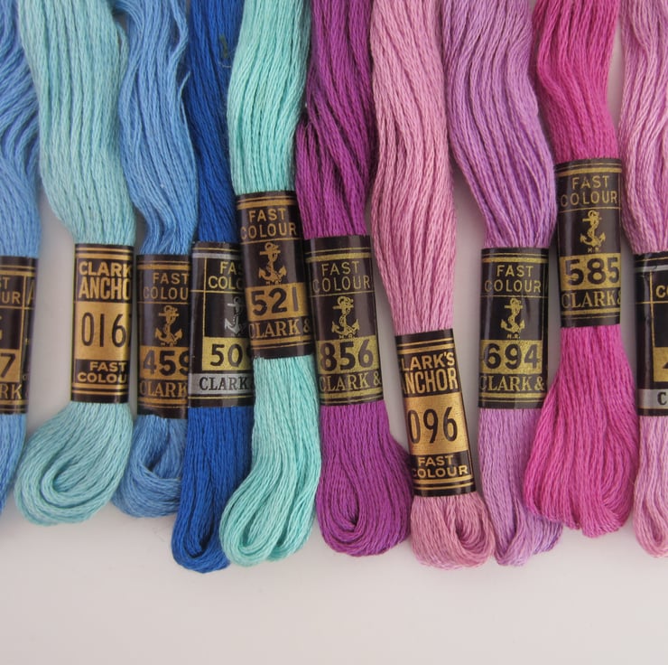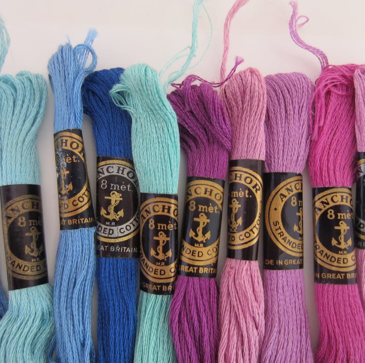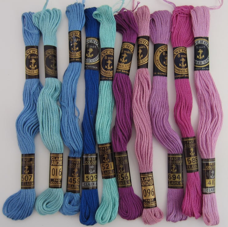 Selection of 10 skeins of Anchor embroidery threads in different shades of blue and mauve.