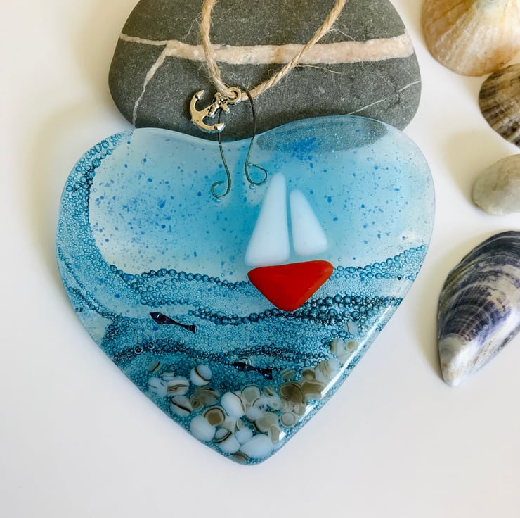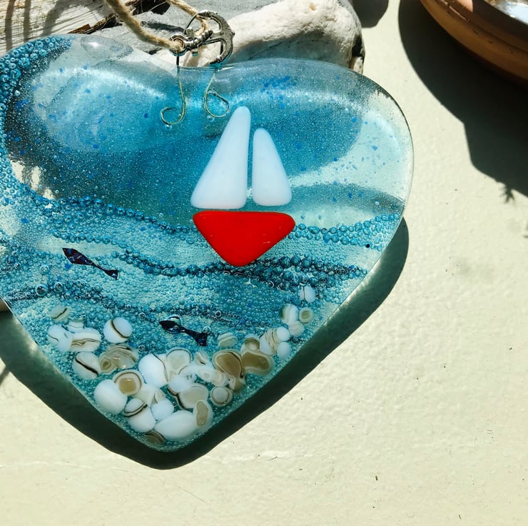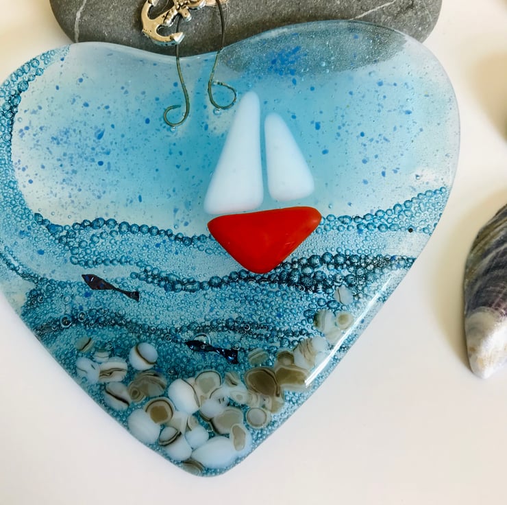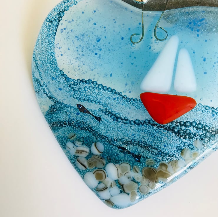 A pretty fused glass heart inspired by my love of the sea. I love going up to Northumberland on holiday and can spend many hours watching the sea I often see little boats in the distance and wish I could be on them.