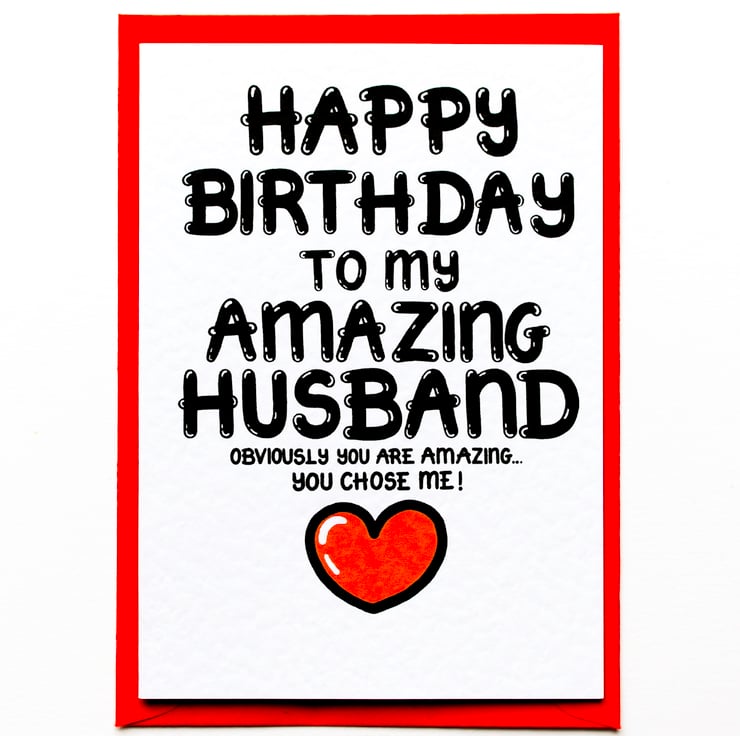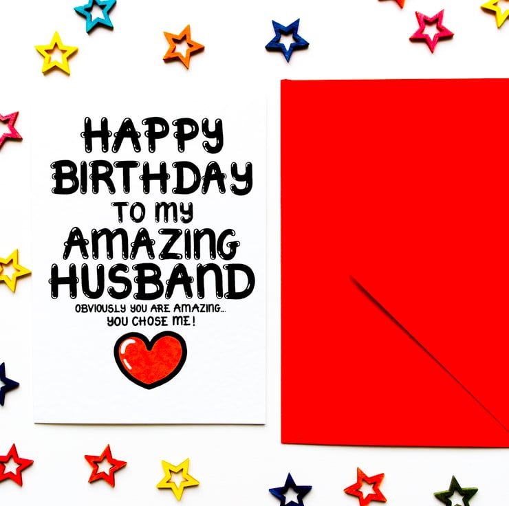 Greeting on front: HAPPY BIRTHDAY TO MY AMAZING HUSBAND OBVIOUSLY YOU ARE AMAZING... YOU CHOSE ME!