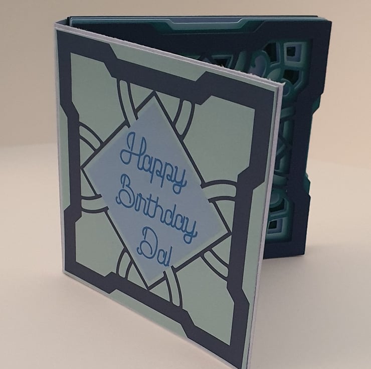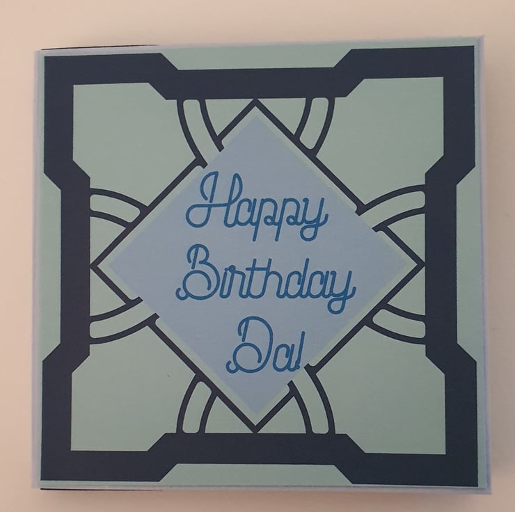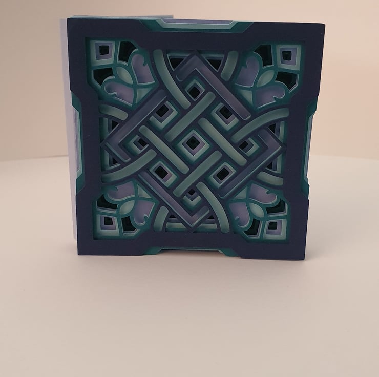 This card has been created in shades of blue card and is 3D showing different layers of the Celtic knot in different shades of blue to pop. The card has a personalised message on the front, and this can be changed to a message of your choice. This card has been created for a birthday, however the front could also be blank (this would have the full knot image instead of a message) or could be for a new job, new home or just to say hello. Just enter your choice of message in the questions when ordering.