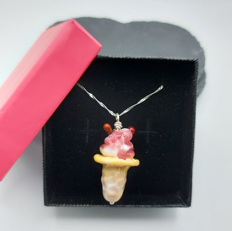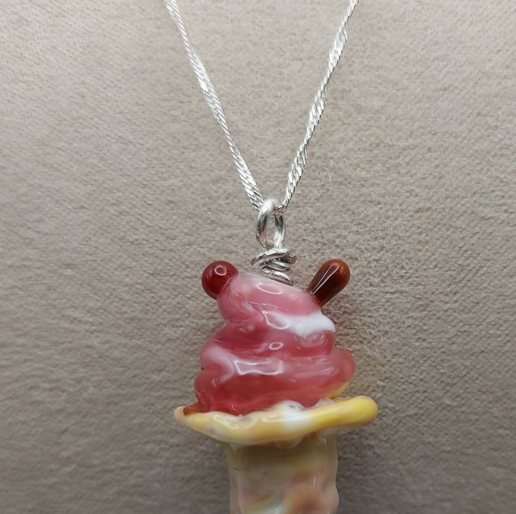 A classic 99 whippy ice cream lampwork pendant with a raspberry style sauce and a chocolate flake. Bring on the summer fun.
