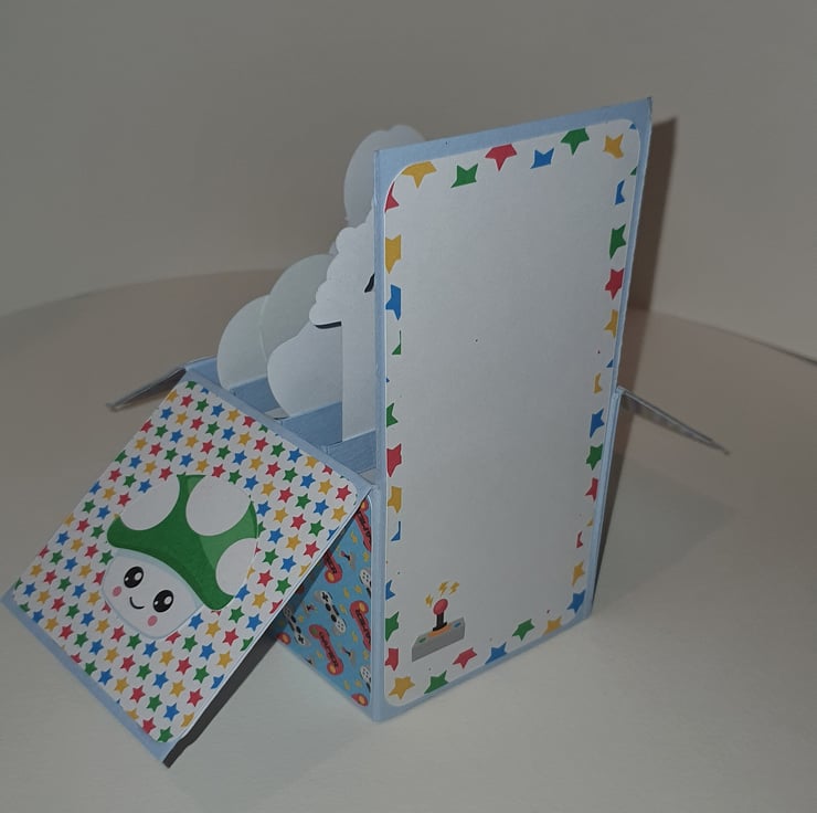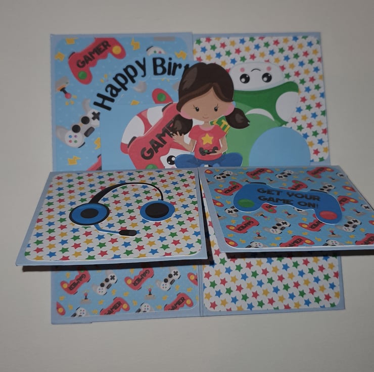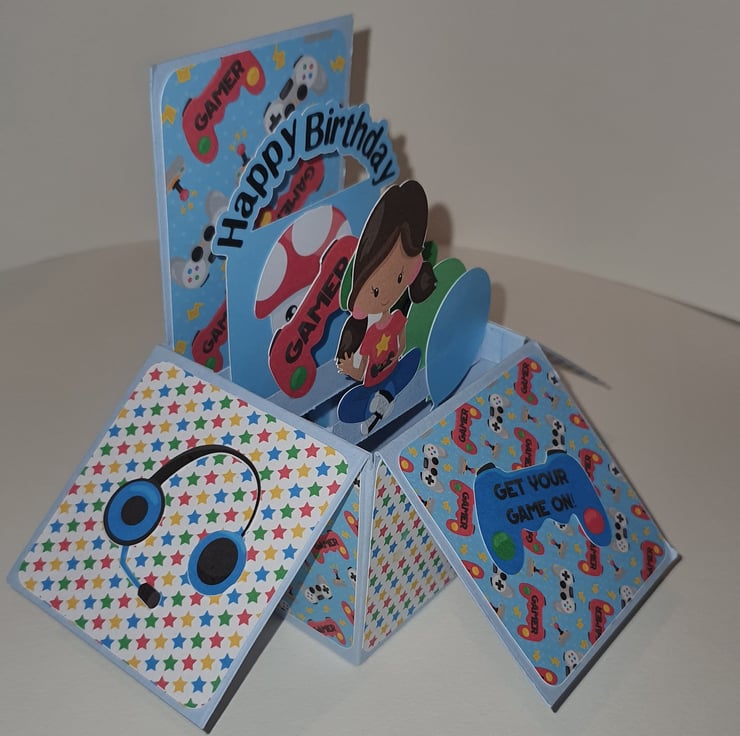 This box card base is in blue and topped with gaming papers. The card is decorated with gaming images and a girl
