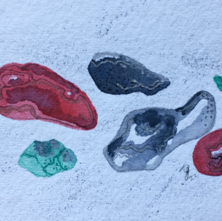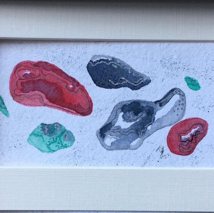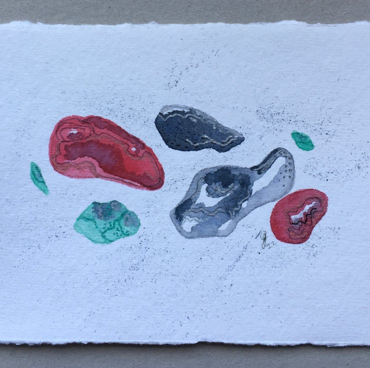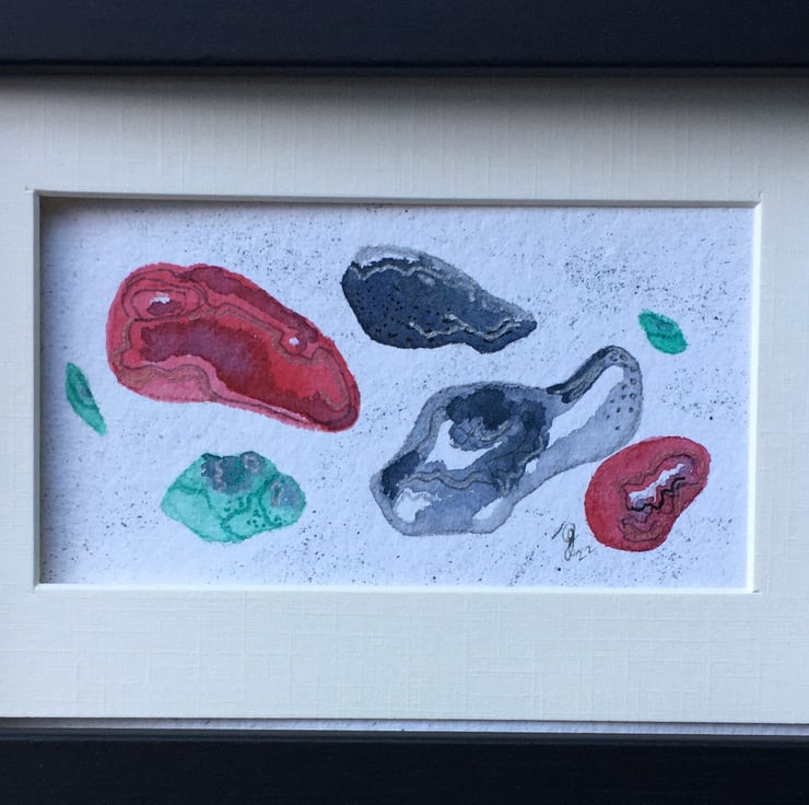 This is a hand painted watercolour using Artist quality materials, depicting my interpretation of beach pebbles. It measures approx 15cm x 10cm and the hand made Khadi paper has a torn deckle edge. It will be sent with a mount in a cello bag within a sturdy envelope, postage free to UK destinations. If overseas, please contact me about postage.