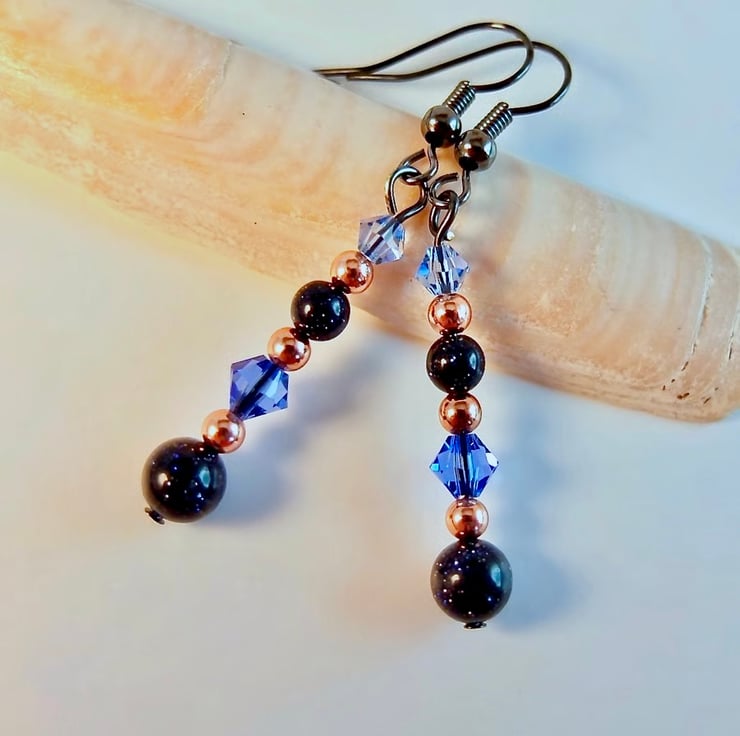 Sparkly earrings made from 6mm and 4mm blue goldstone, 5mm Swarovski 'sapphire' and 4mm 'light sapphire' bicones and 3mm solid copper rounds.