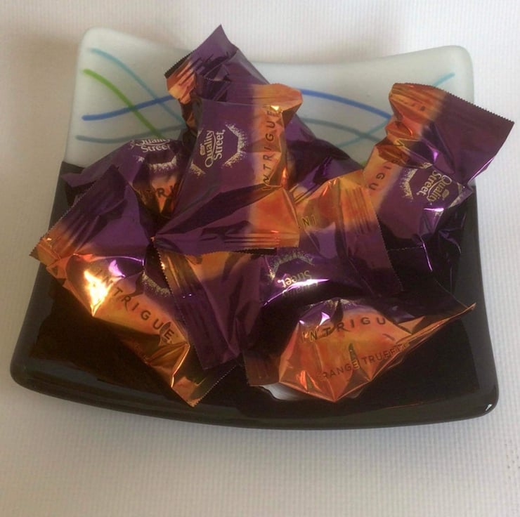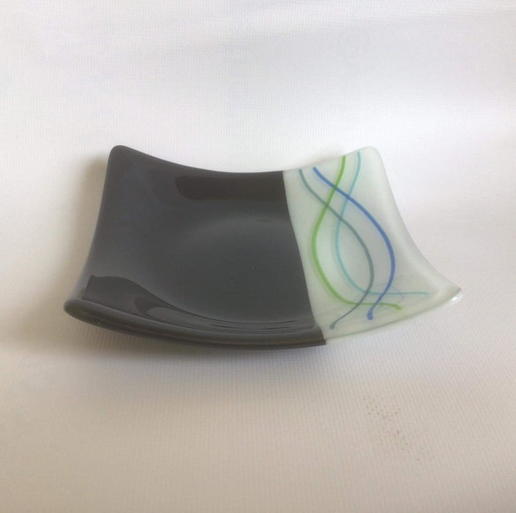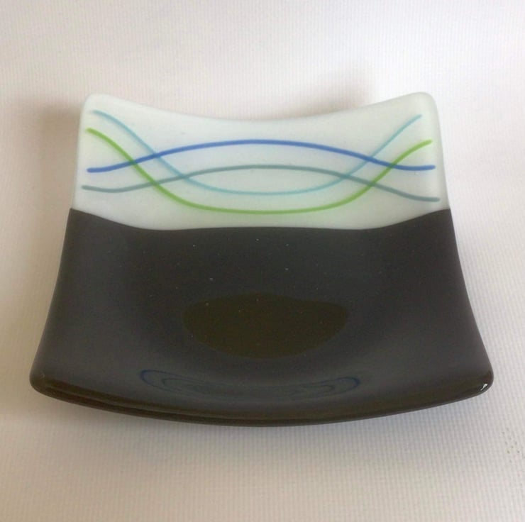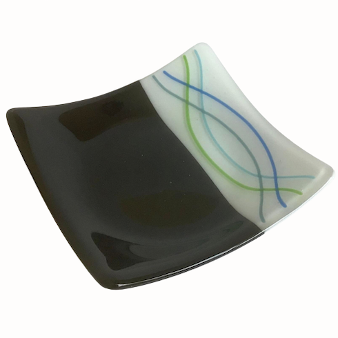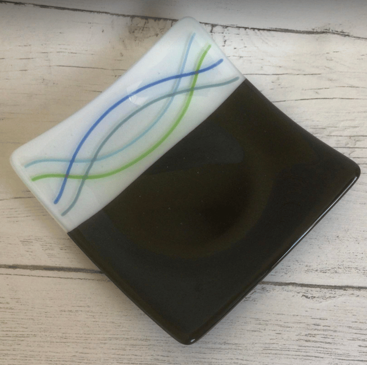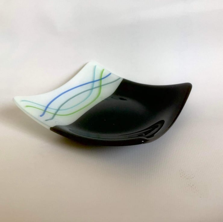 This fused glass dish in classic black and white has been given extra interest with the addition of a twisted cable design made from thin glass rods. The rods are initially shaped in the kiln over a steel former and then laid out on the white section of glass in an interlocking design. The whole panel is fired in the kiln to fuse it all together and then fired again over a former to give it the finished shape.