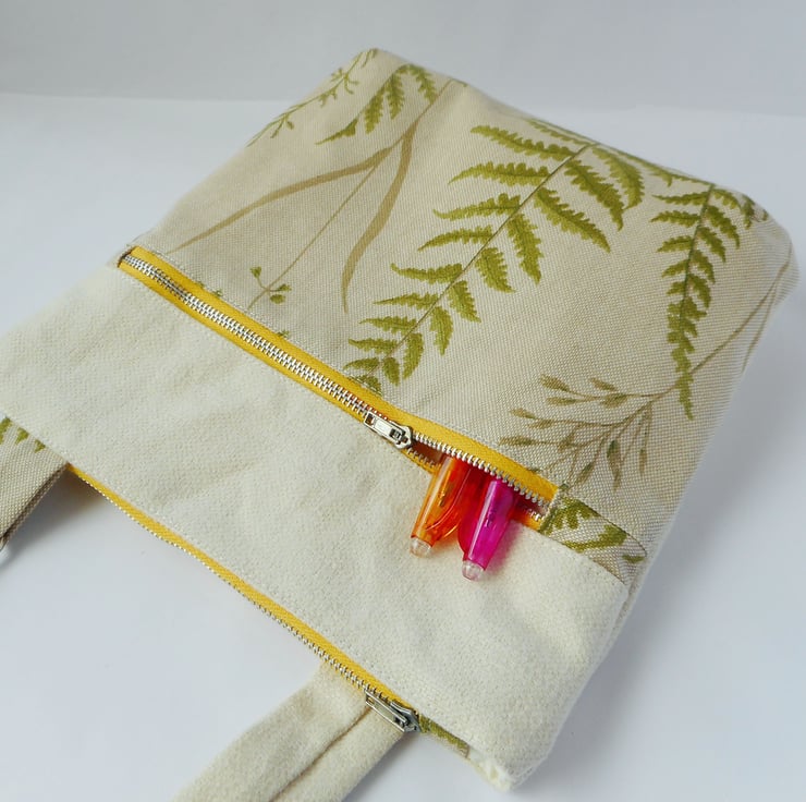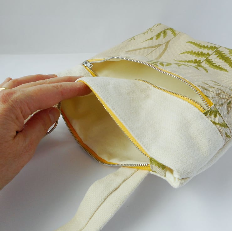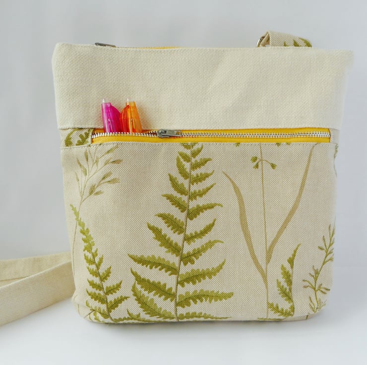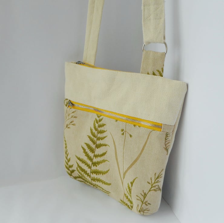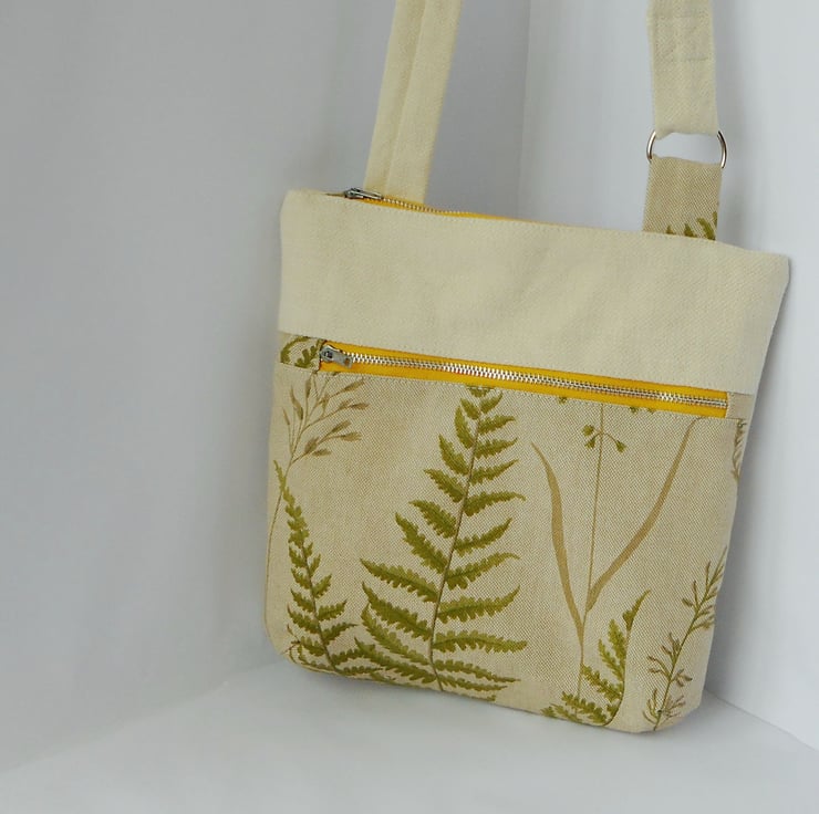 The front panel fabric is a lovely fern and grass print in different greens on a greyish cream background, whilst the rest of the bag, including the strap, is a woven cotton in ivory.