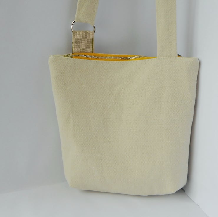 The pocket is accessed from the front, and is secured with a metal toothed zip. The top opening of the bag is also zipped, and the bag is fully lined with cream polycotton.