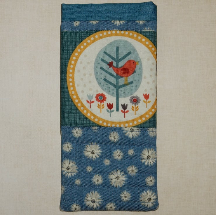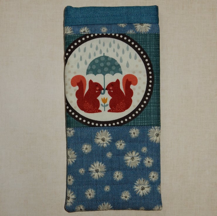 This beautiful glasses case features red squirrels under an umbrella on one side and a bird in a tree on the other (see photos). The two pictures are from the same range of fabric, with a toning daisy print and a plain lining. It has been quilted to enhance the effect. It is made from cotton fabrics with a layer of wadding for protection. This is a slip in style glasses case, if you require a case which fastens please view my other listings.