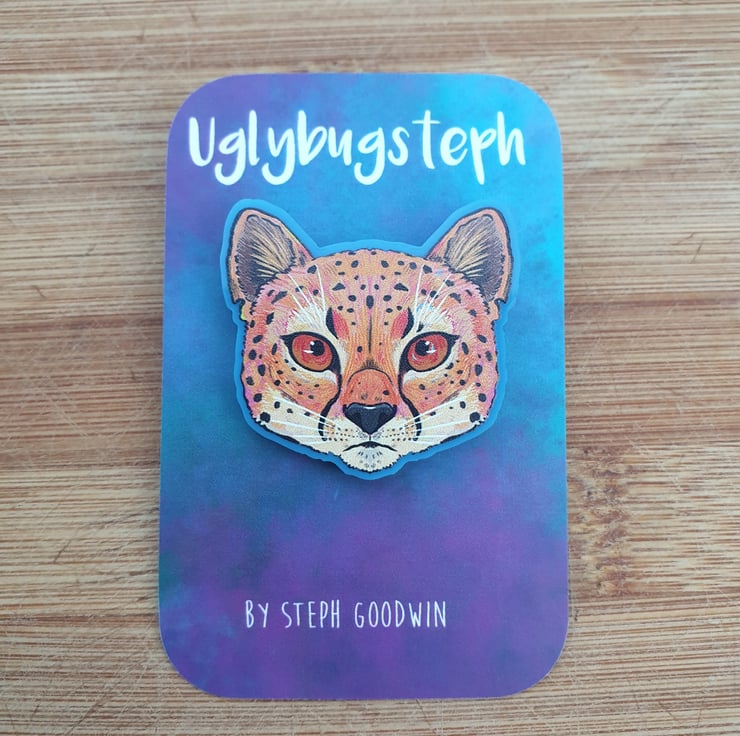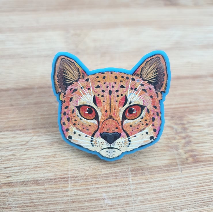 This pin is approx 40mm square and is printed onto either blue or translucent yellow acrylic.