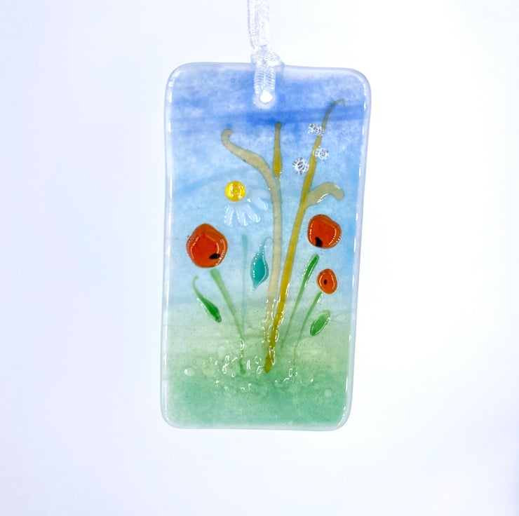 A lovely little fused glass light catcher with a mix of poppies & daisies. Hung on a piece of organza ribbon it allows the light to travel through - this gives the piece depth and shows off the full beauty of the glass.