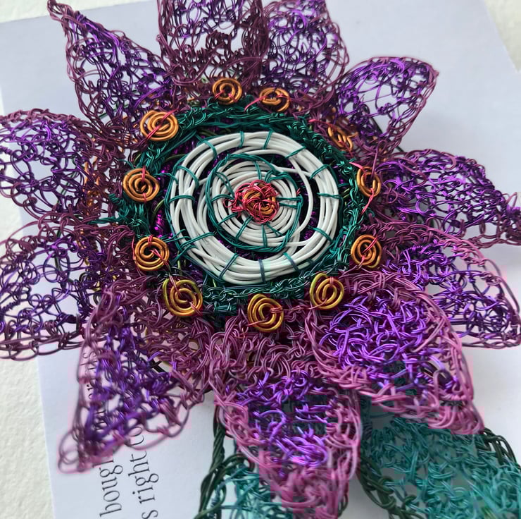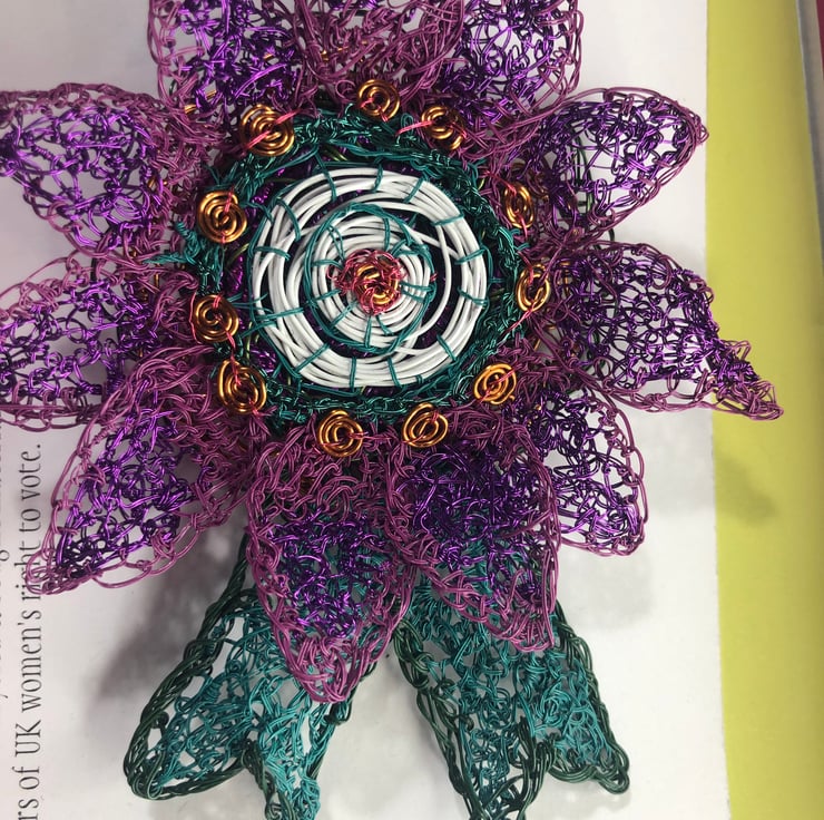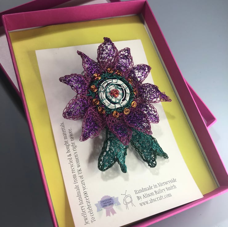 Collectable Commemorative Rosette for Women - Purple, green and white brooch. I made a small edition of large rosettes to make 100 years of the women's right to vote in 2018 in Britain. Using the colours of the suffrage movement, I created 19 brooches from wire reclaimed from televisions and bought wire backed with plastic from packaging. For more information on the history of the suffrage movement in the UK https://www.bl.uk/votes-for-women/articles/suffragists-and-suffragettes.
