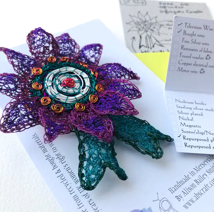 Made in Wirral by me, Alison Bailey Smith. I trained as a jeweller in Edinburgh in the 80s and 90s and have been recycling since then, in different places all round the world. I am now back in the UK and recently acquired wires from lots of old televisions so am having great fun with new colours.My work is definitely a by-product of the 21st century & I have been described as a 'techno -cannibal' by BBC journalist Clare English. My career has spanned 3 decades and three different countries since leaving Edinburgh College of Art in 1990. The motivation behind my work comes from being the child of post war parents, Scottish thriftiness and an avid watcher of Blue Peter (yes, I have a badge)! I am keen to re-use, re-develop and re-create in my home and in my business.