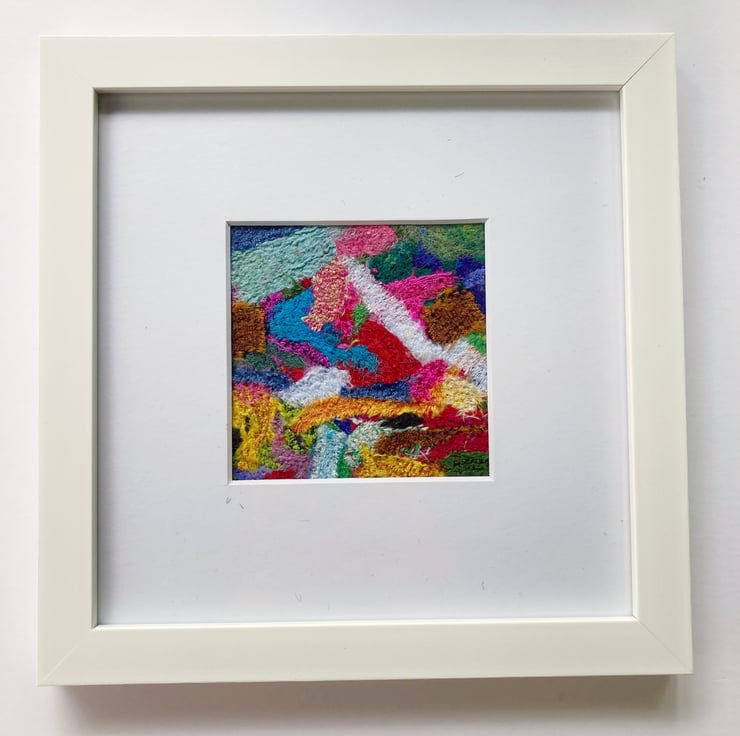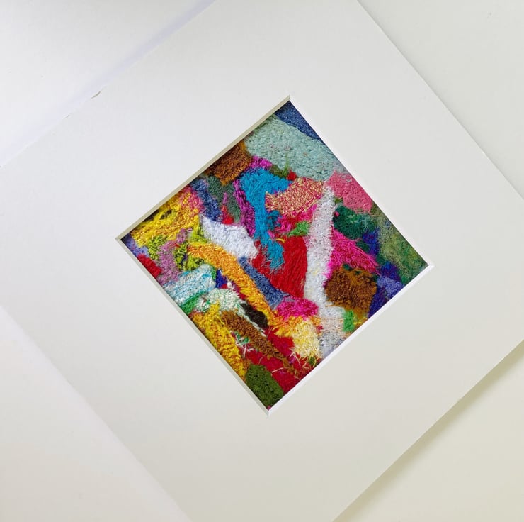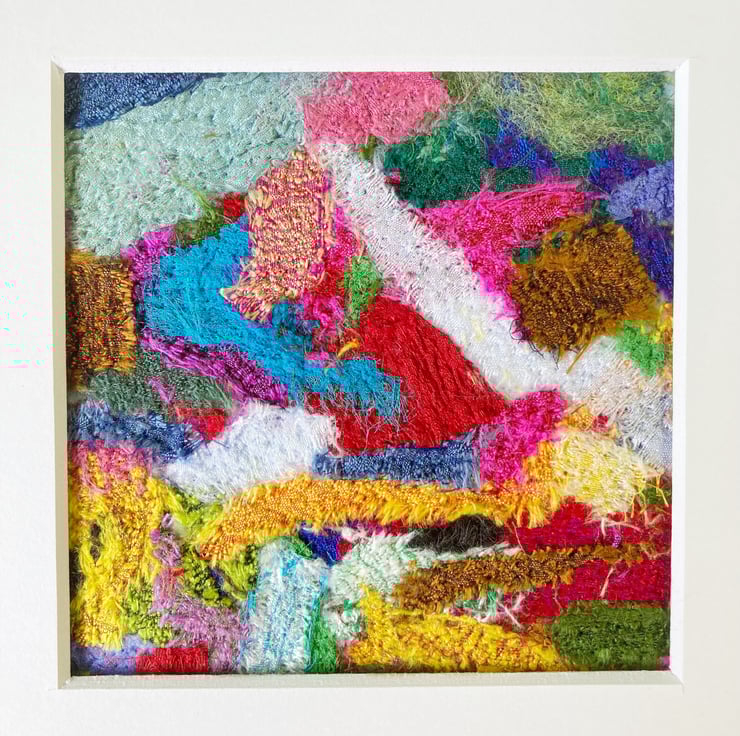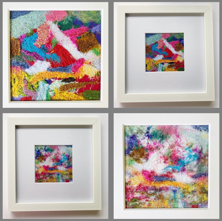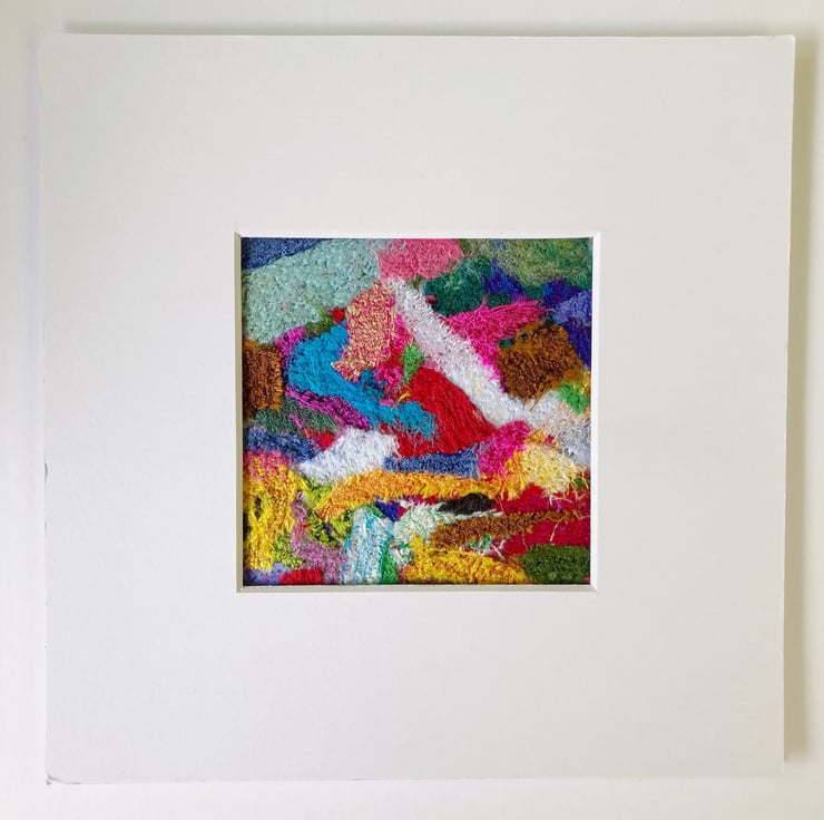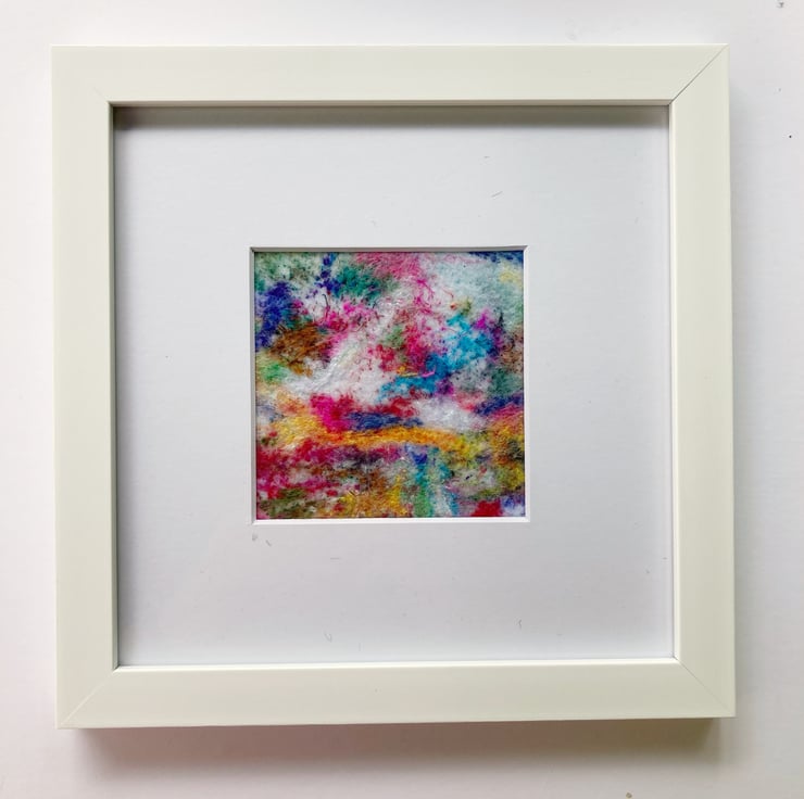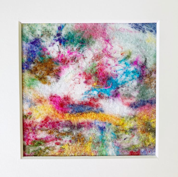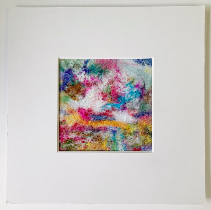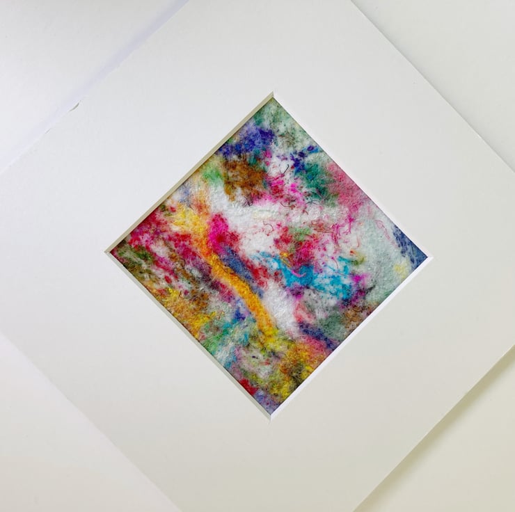 This dual sided abstract picture allows you to choose which image you prefer. Multicoloured silk fabric and wool fibre scraps have been needle felted to a felt base fabric in an abstract pattern. The needle felting process binds the fabric and fibres to the backing felt without the need for stitching. In addition to binding the fabrics, the needle felting creates a beautiful texture to the surface of the picture, with the raw edges of the fabric left exposed in places to add to the artwork. The fine barbed felting needles push fibres through the felt fabric binding it in place which result in the reverse of the work shows a reverse image of the picture created by the fibres that have been pushed through the silk. This allows you to choose either the vibrant silk fabric picture or a slightly muted version on the reverse created from the threads. The picture has been provided with an 8' x 8" white card mount with a picture area of 4"x 4" and has been mounted in such a way that the piece can easily be reversed.