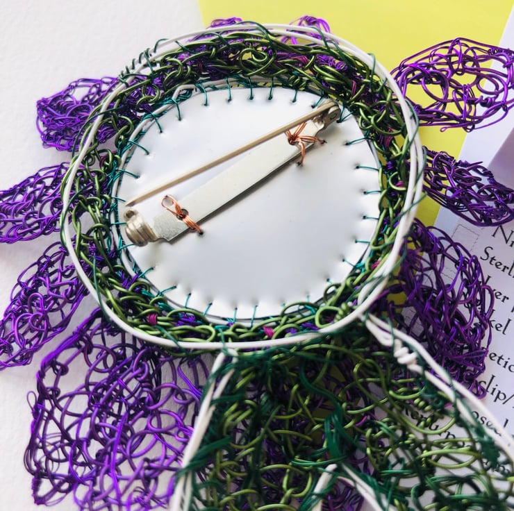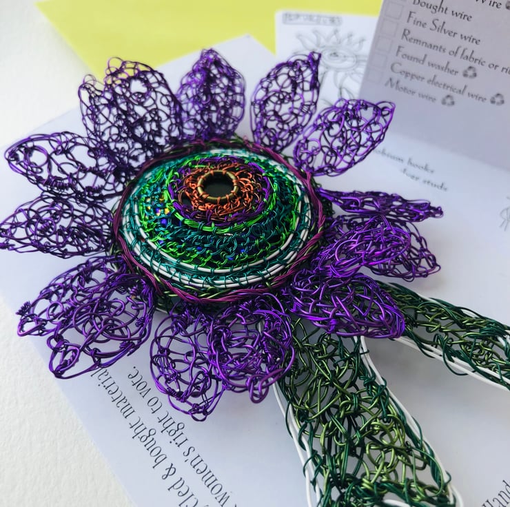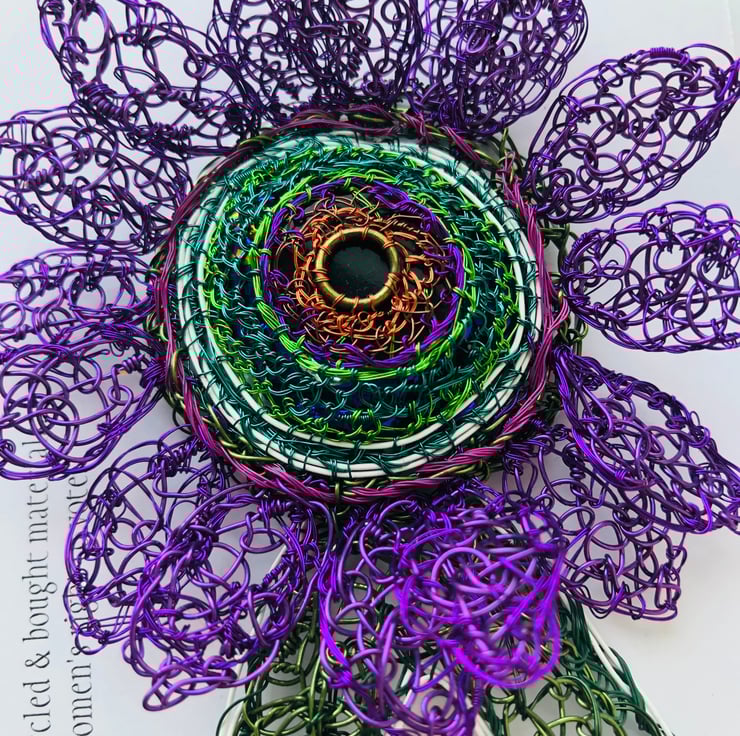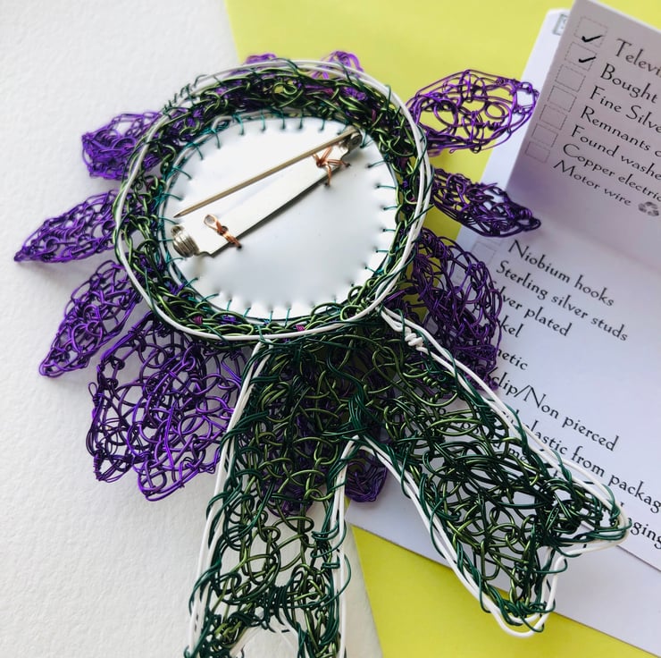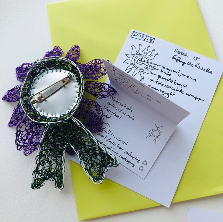 Collectable Commemorative Rosette for Women. I made a small edition of large rosettes to make 100 years of the women's right to vote in 2018 in Britain. Using the colours of the suffrage movement, I created 19 brooches from wire reclaimed from televisions and bought wire backed with plastic from packaging. For more information on the history of the suffrage movement in the UK https://www.bl.uk/votes-for-women/articles/suffragists-and-suffragettes.