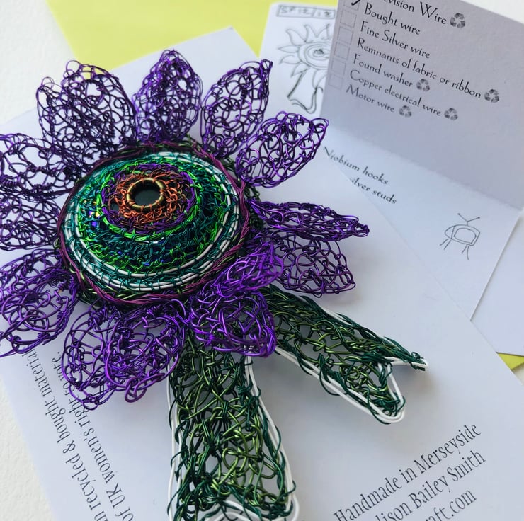 Made in Wirral by me, Alison Bailey Smith. I trained as a jeweller in Edinburgh in the 80s and 90s and have been recycling since then, in different places all round the world. I am now back in the UK and recently acquired wires from lots of old televisions so am having great fun with new colours.My work is definitely a by-product of the 21st century & I have been described as a 'techno -cannibal' by BBC journalist Clare English. My career has spanned 3 decades and three different countries since leaving Edinburgh College of Art in 1990. The motivation behind my work comes from being the child of post war parents, Scottish thriftiness and an avid watcher of Blue Peter (yes, I have a badge)! I am keen to re-use, re-develop and re-create in my home and in my business.