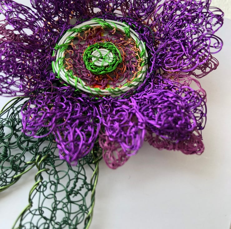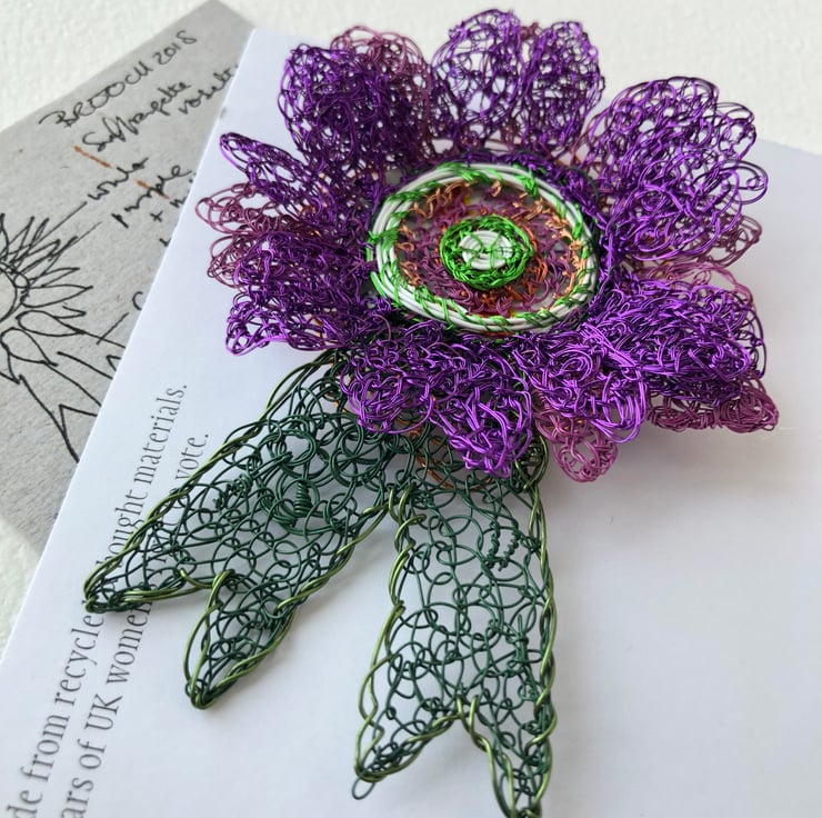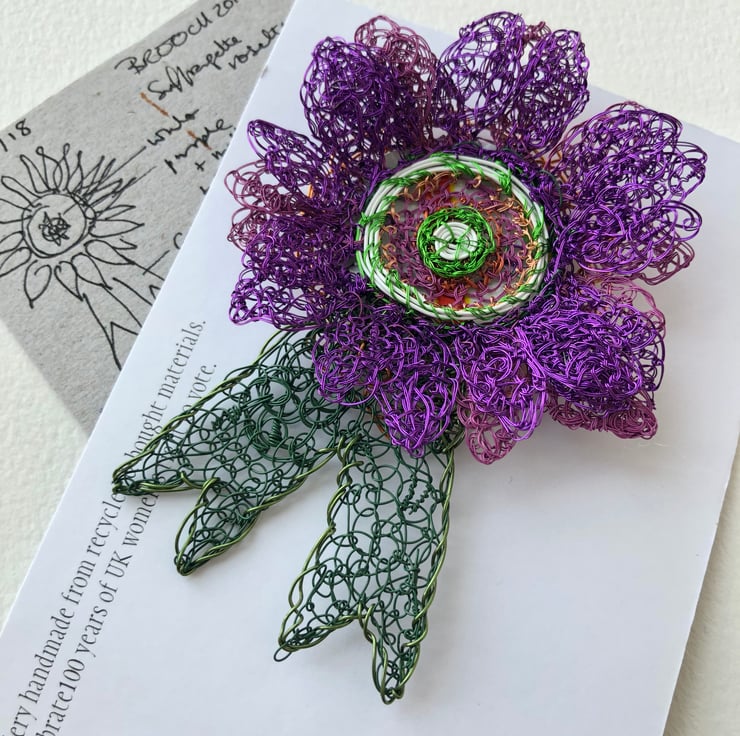 Collectable Commemorative Rosette for Women. I made a small edition of large rosettes to make 100 years of the women's right to vote in 2018 in Britain. Using the colours of the suffrage movement, I created 19 brooches from wire reclaimed from televisions and bought wire backed with plastic from packaging. For more information on the history of the suffrage movement in the UK https://www.bl.uk/votes-for-women/articles/suffragists-and-suffragettes.