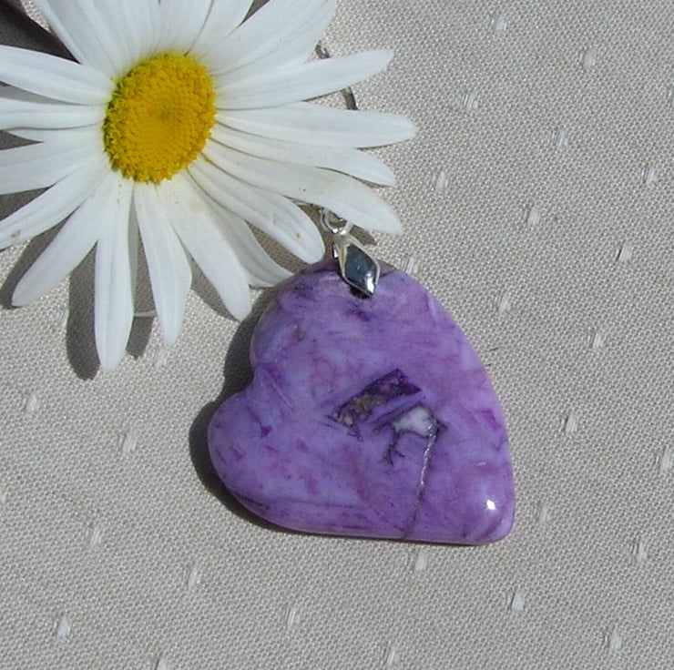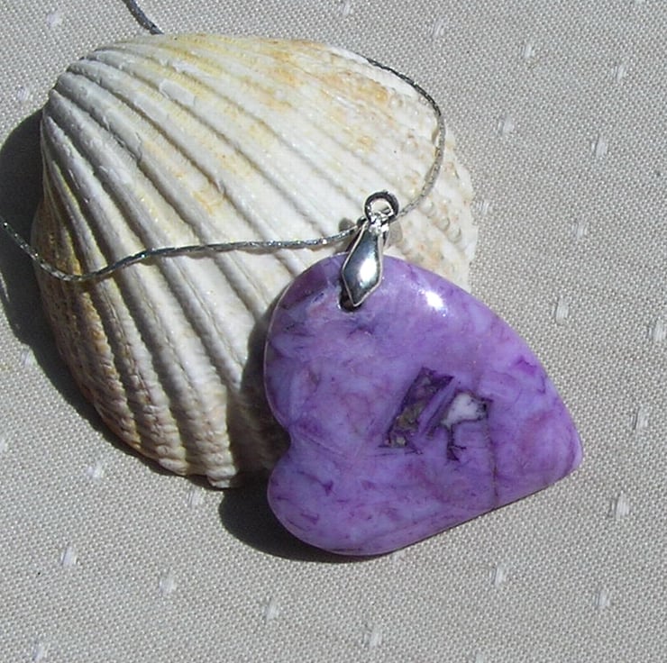 This Stunning polished Faceted Purple Bamboo Agate Heart Cabochon is mounted at an angle from a Sterling Silver Bail… It is flat on the reverse so rests comfortably on the neckline
