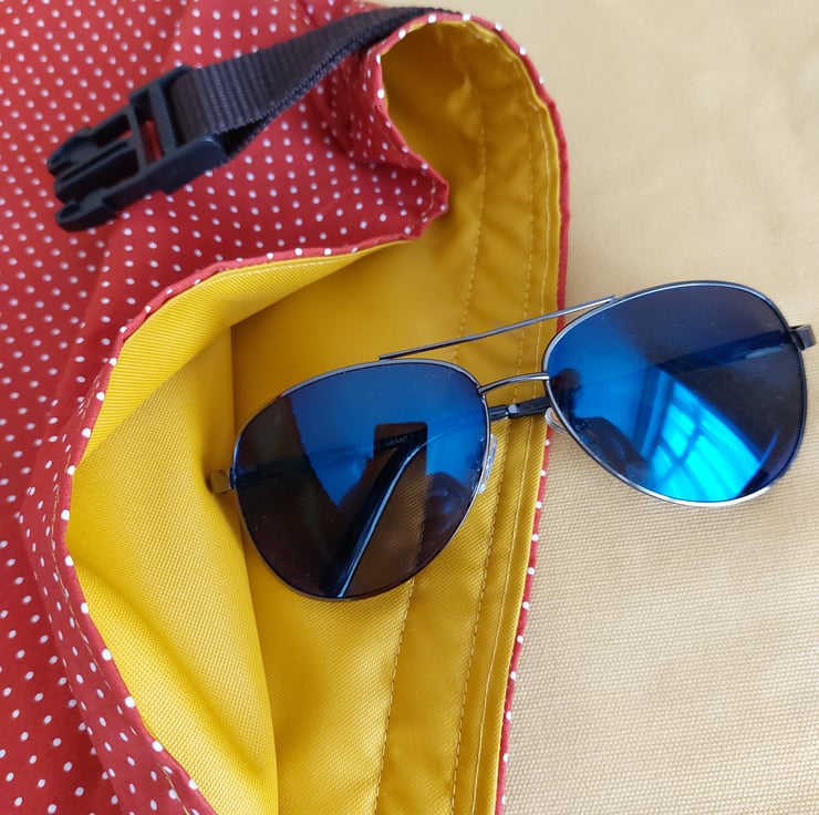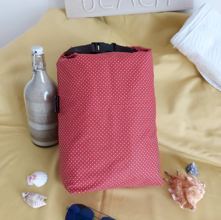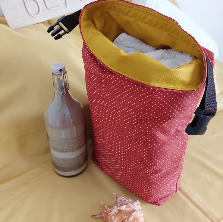 Drybag measuring 43x31cm. Depth of boxed corners are 10cm. Interior is a rubberised waterproof mustard lining with a handle inside for hanging out to dry. Outer is a coated cotton fabric. Roll top design with a webbing strap secured with a clip.