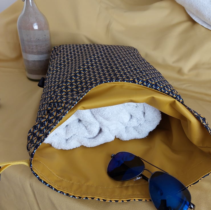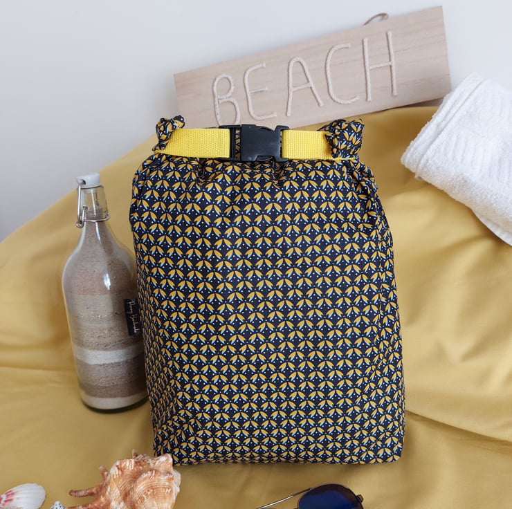 Drybag measuring 44x34cm. Depth of boxed corners are 10cm. Interior is a rubberised waterproof mustard lining with a handle inside for hanging out to dry. Outer is a coated cotton fabric. Roll top design with a webbing strap secured with a clip.