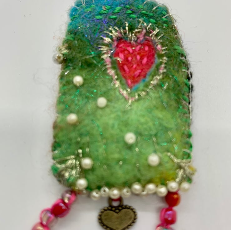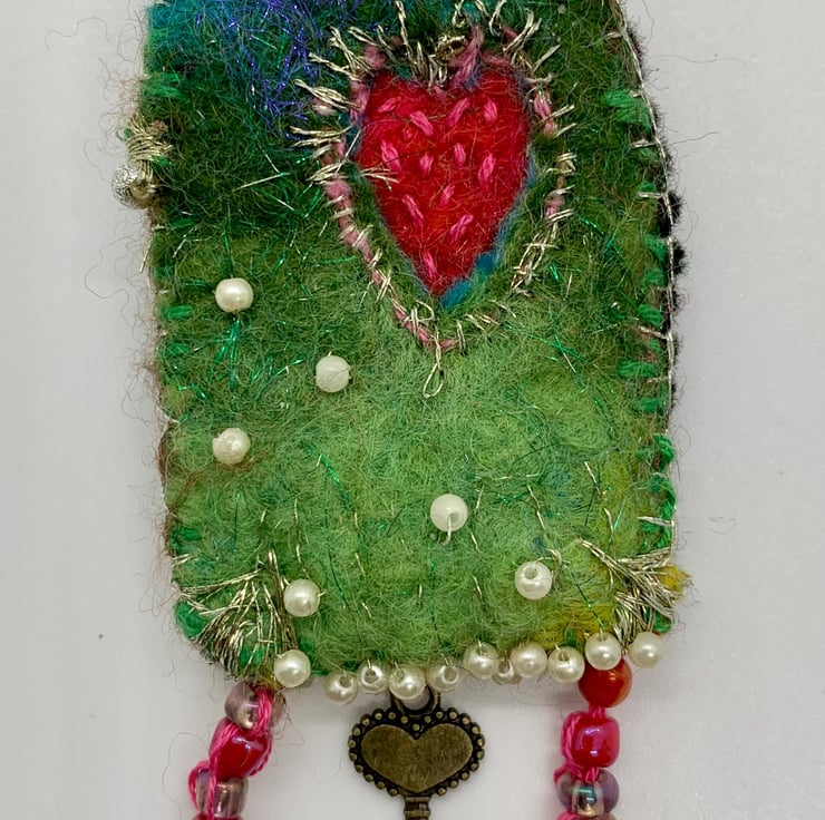 Wet felted merino wool in tones of green and blue with a little red cut-out heart.