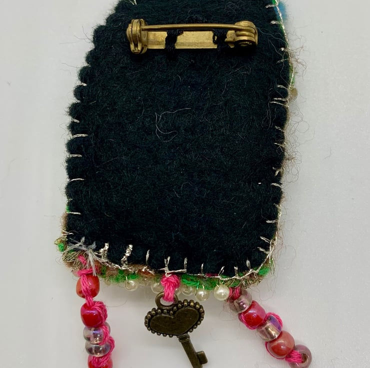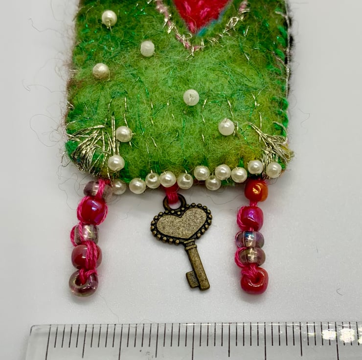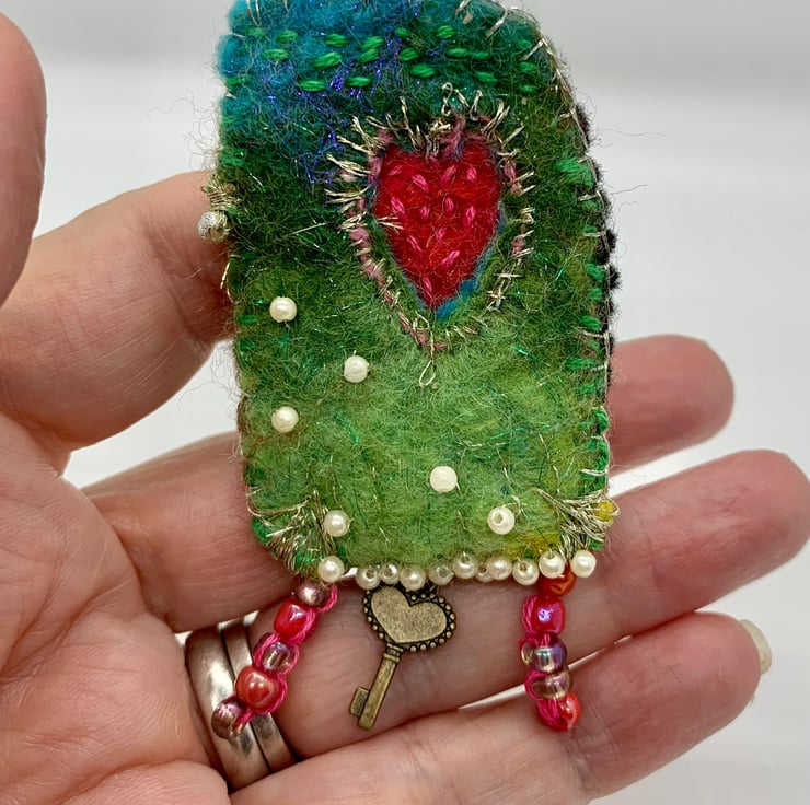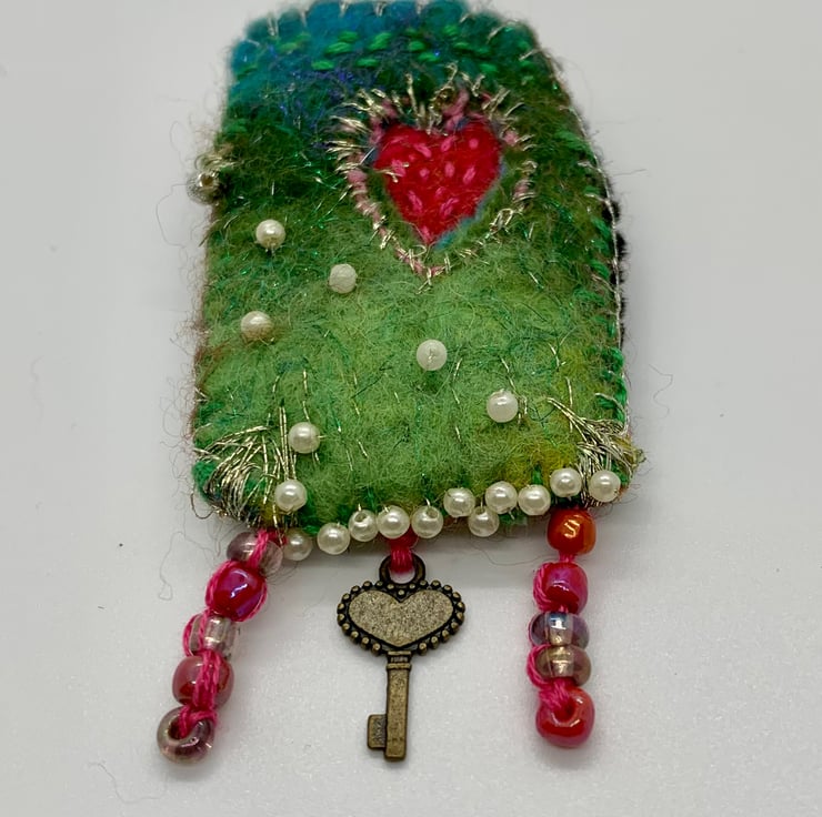 Handmade felt and hand embroidered heart brooch embellished with beads and a tiny key.