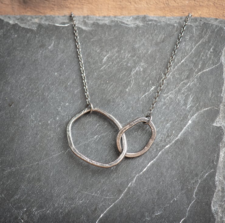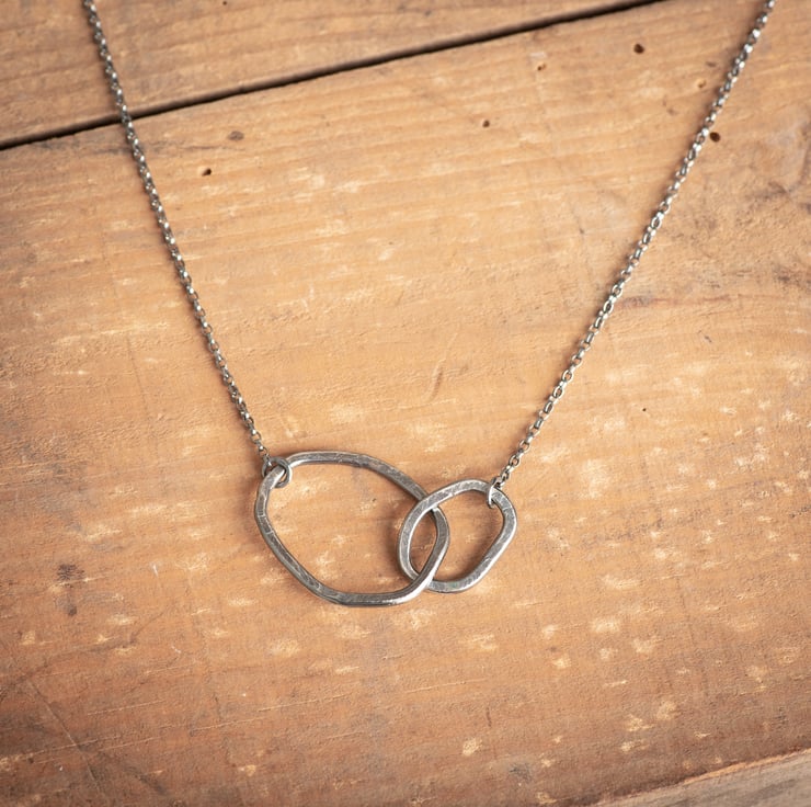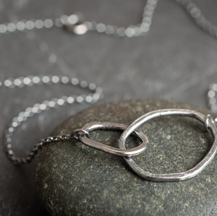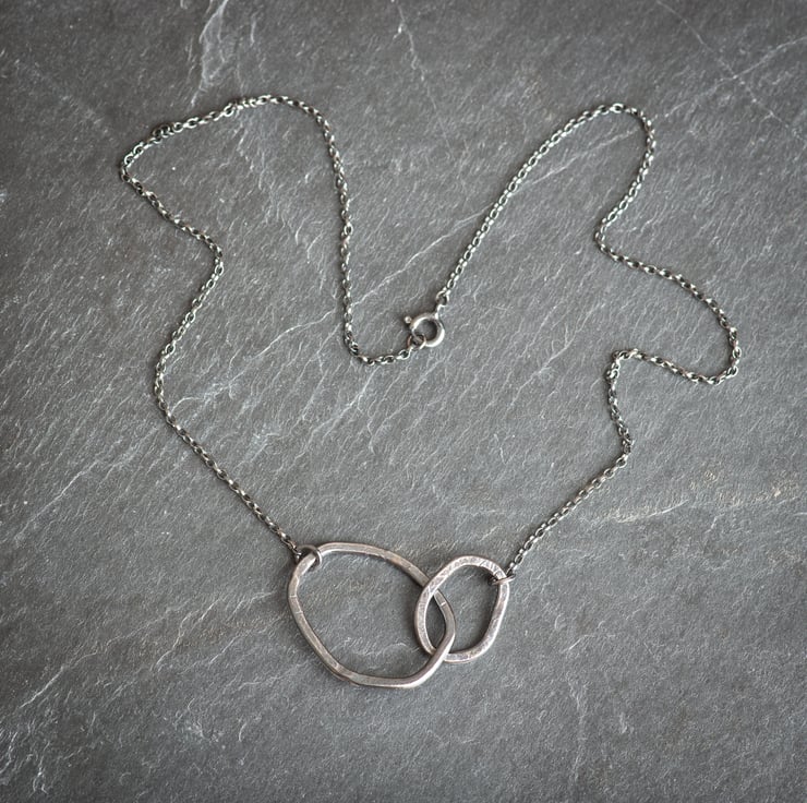 To make this necklace I hand form, solder, texture and oxidise the silver loops which are organically shaped and linked together. As each necklace is made by hand, the loops are slightly different shapes each time. (Yours may differ from the photo, but will be very similar in size and shape. As is the joy of handmade!)