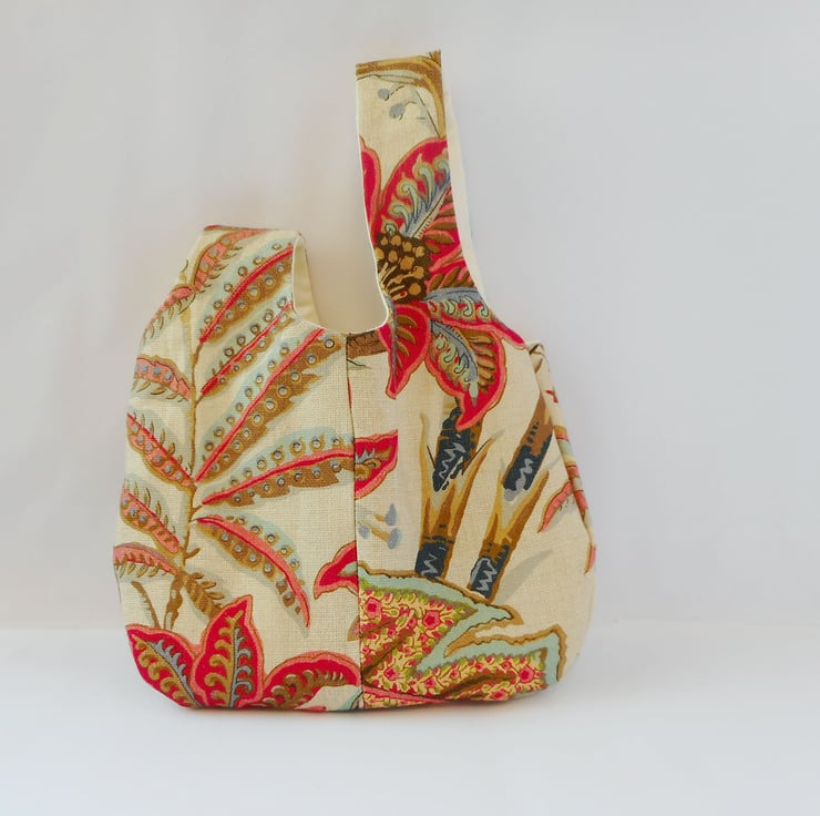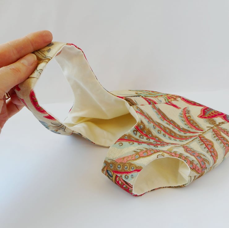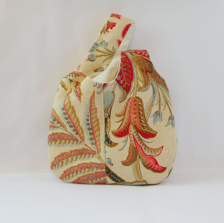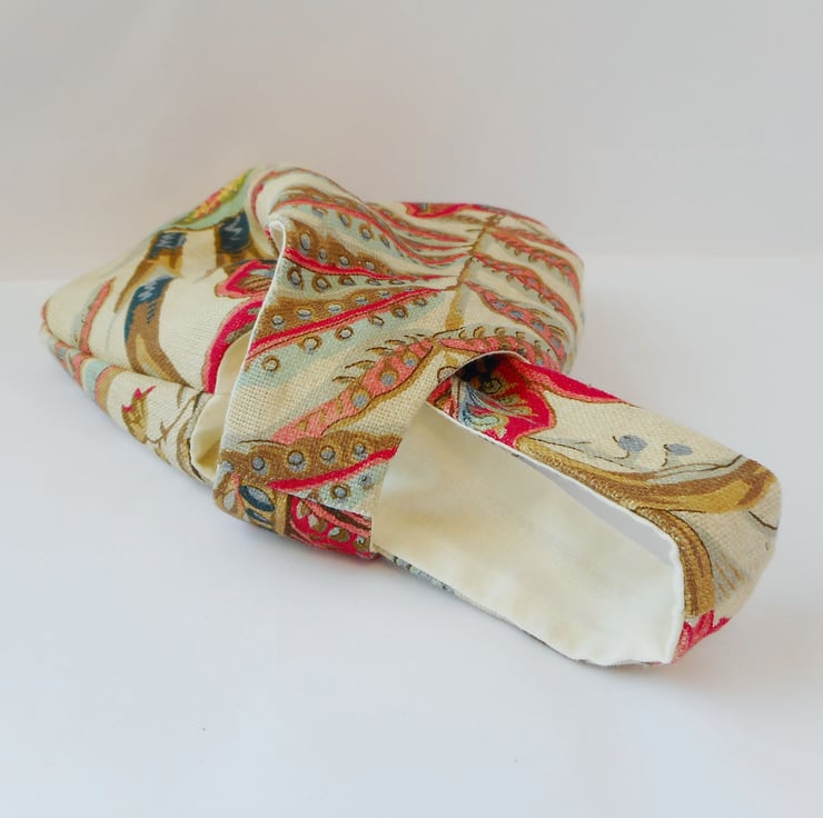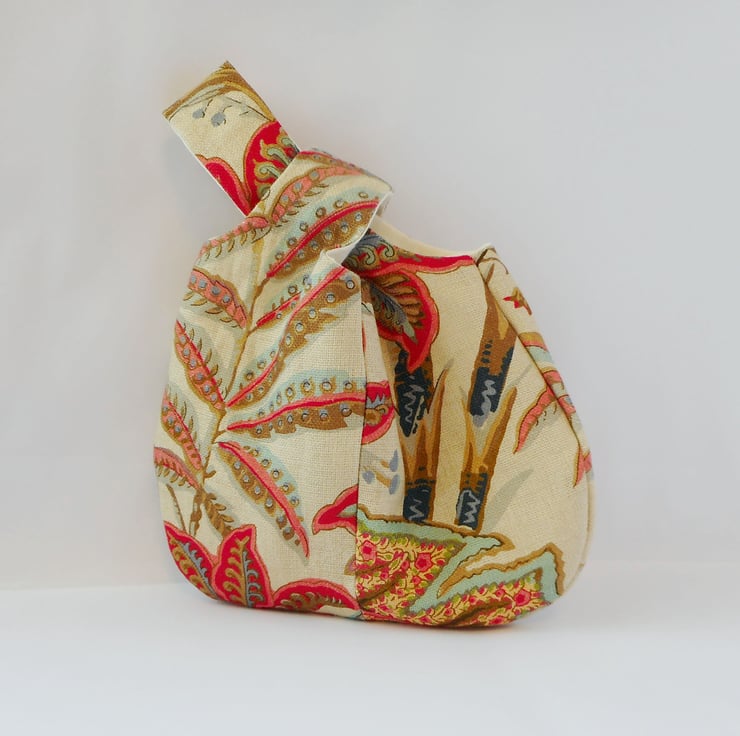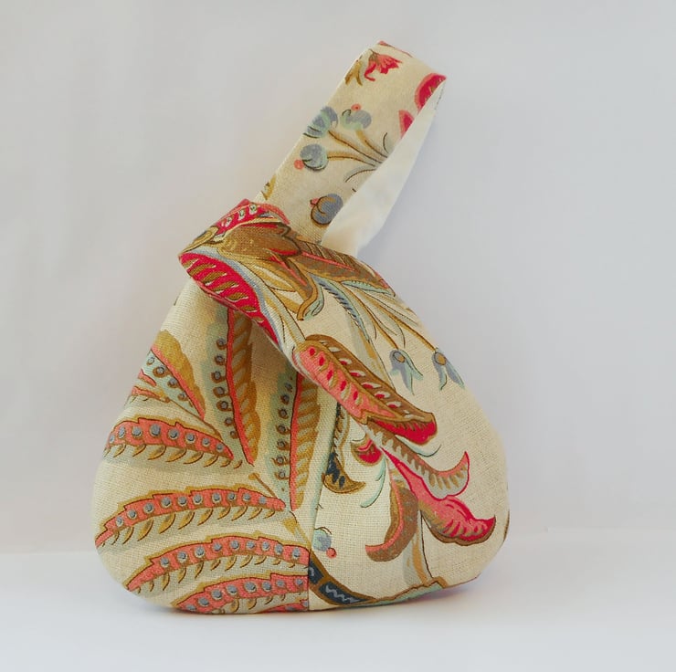 Parvati is a Japanese Knot bag. made from a beautiful printed linen, Paisley Leaf by Colefax & Fowler. It is fully lined in a cream polycotton.