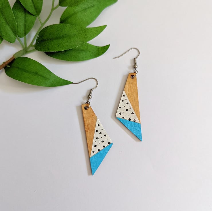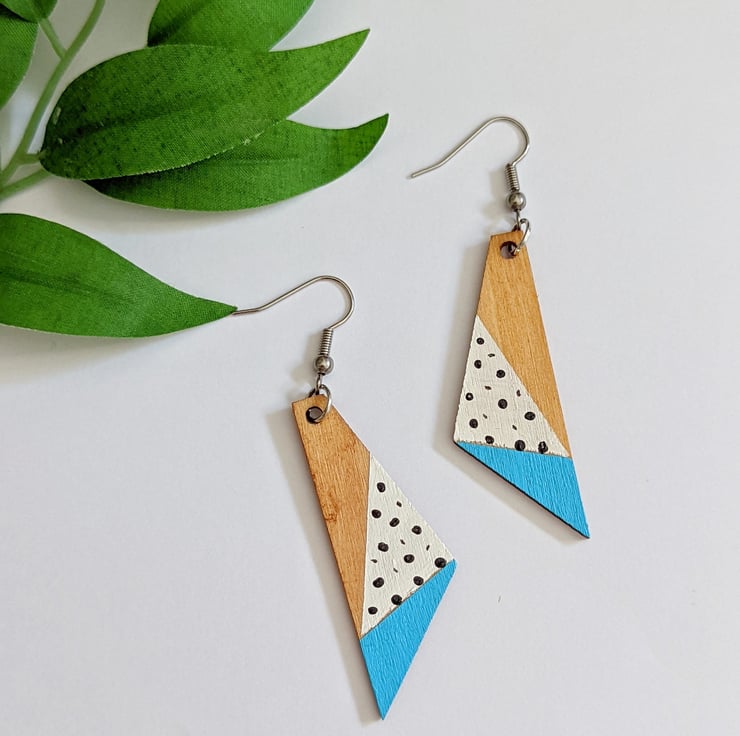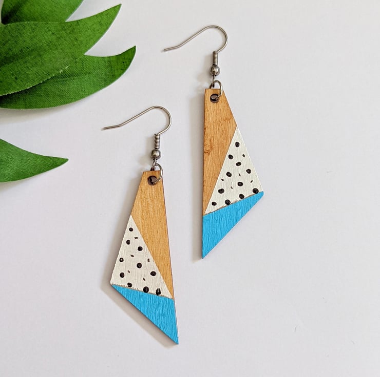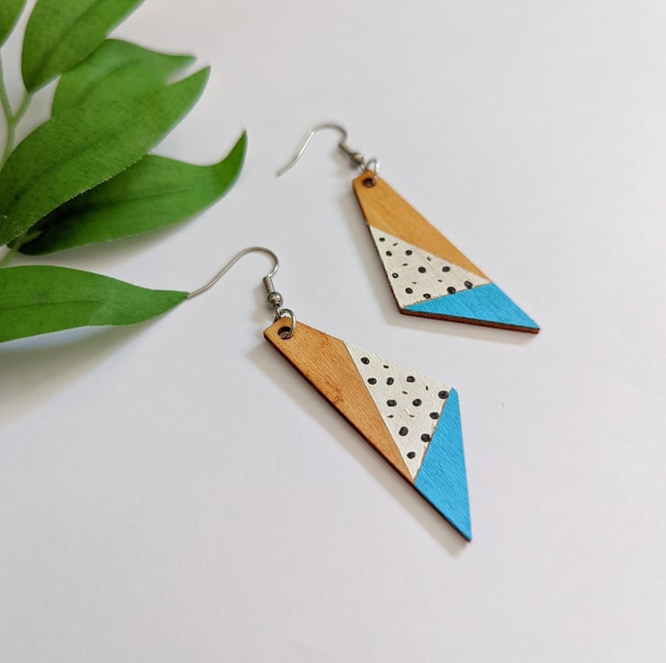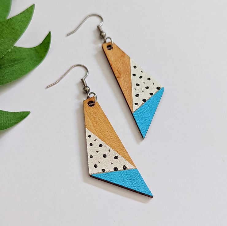 Bright Eye-catching two tone geometric triangles of colour pop with a splash of polka dots all hand painted with heavy body acrylic paint