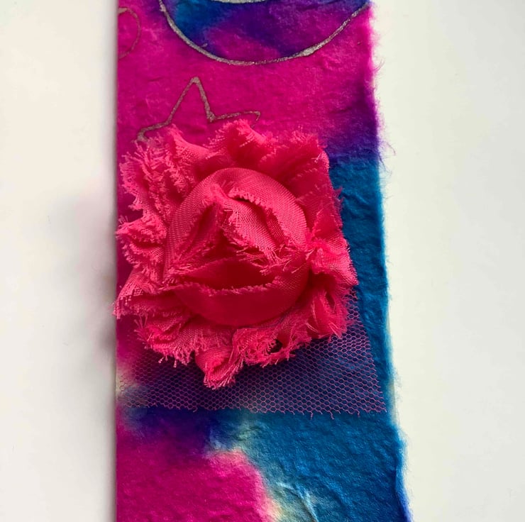 This pink, blue and purple paper on the front has been torn at the edges for a softer look.