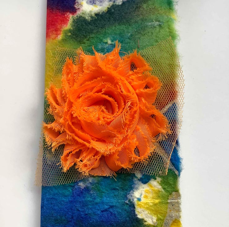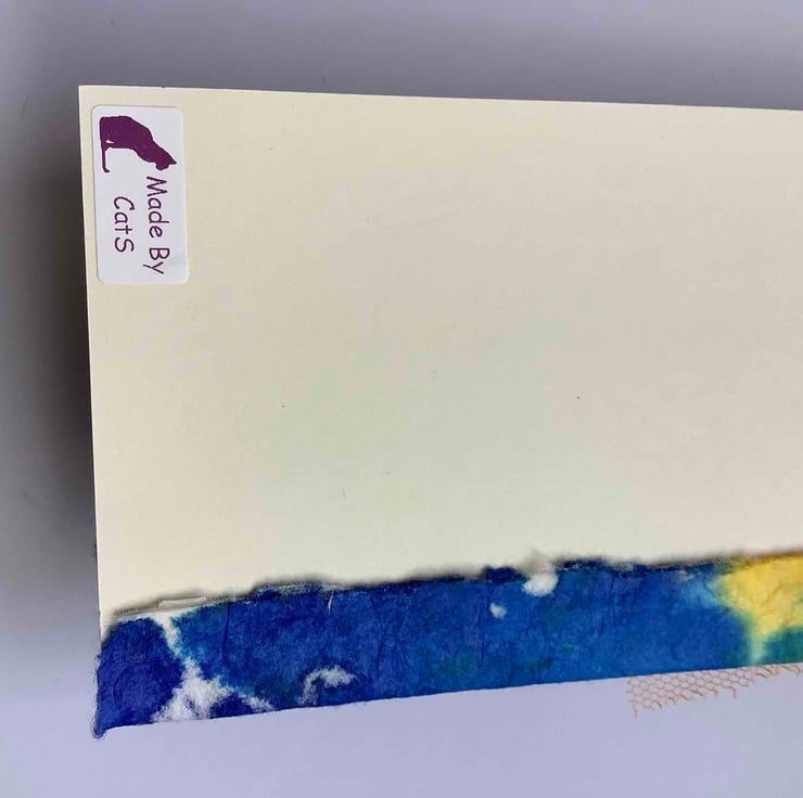 This yellow, blue, green and silver paper on the front has been torn at the edges for a softer look.