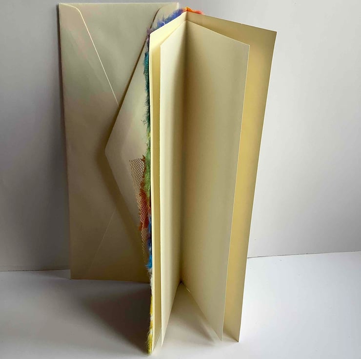 This is a handmade card which is blank for your own message. The card and envelope are ivory and the insert is also ivory.