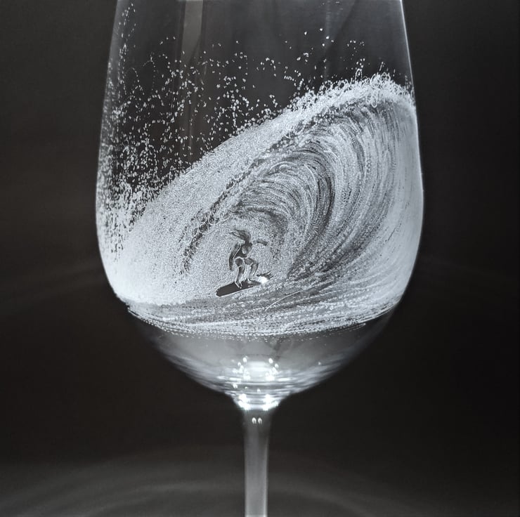 This is a hand engraved wine glass. It is carefully etched with illustration of a surfer coming through a wave barrelling all around them.