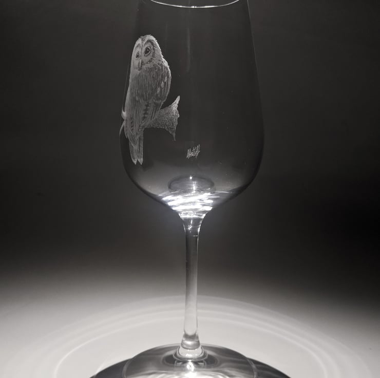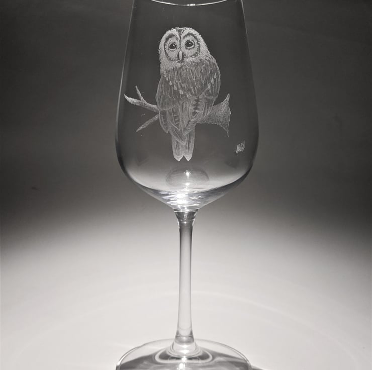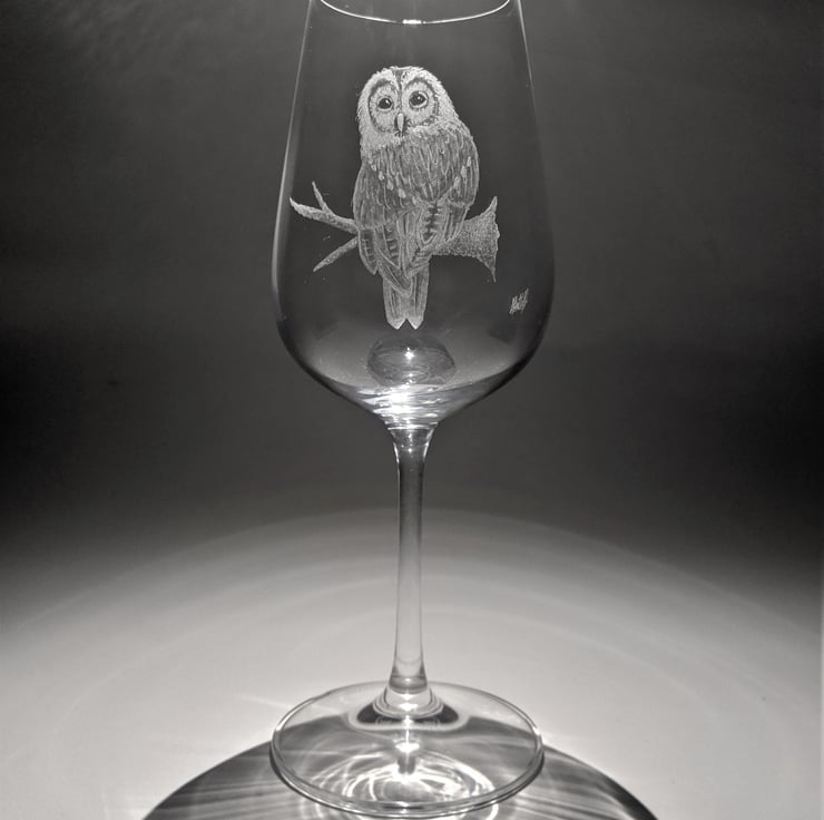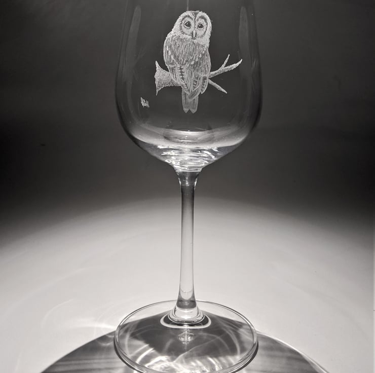 This is a hand engraved wine glass. It is carefully etched with a detail illustration of an owl perching on a branch