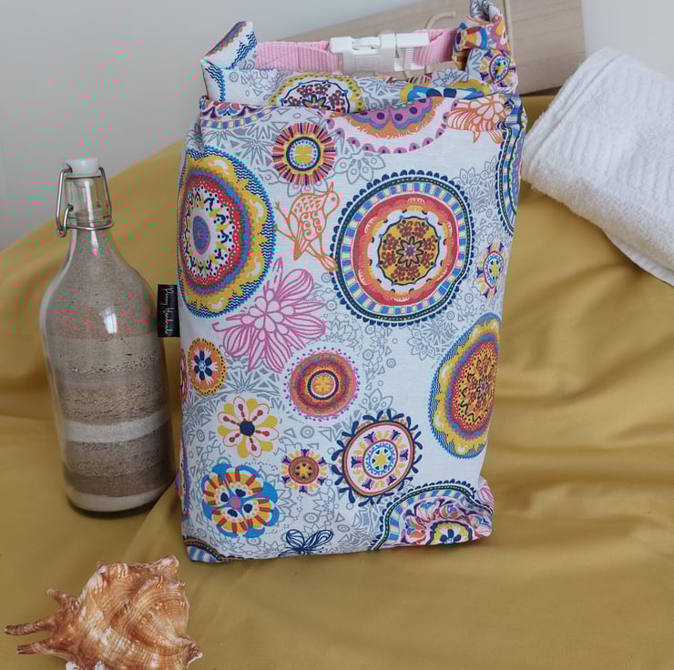 Pack away all your wet gear after swimming or the gym. Handmade using a coated cotton canvas fabric outer with a mandala design. Item is lined with a navy rubberised waterproof fabric including a handle inside to assist hanging out to dry after use. Drybag measures 50cm in length and is 32cm wide, depth of boxed corners are 11cm. item has a rolltop using webbing and is secured using the attached clip. This item is waterproof and has a wipe clean outer.