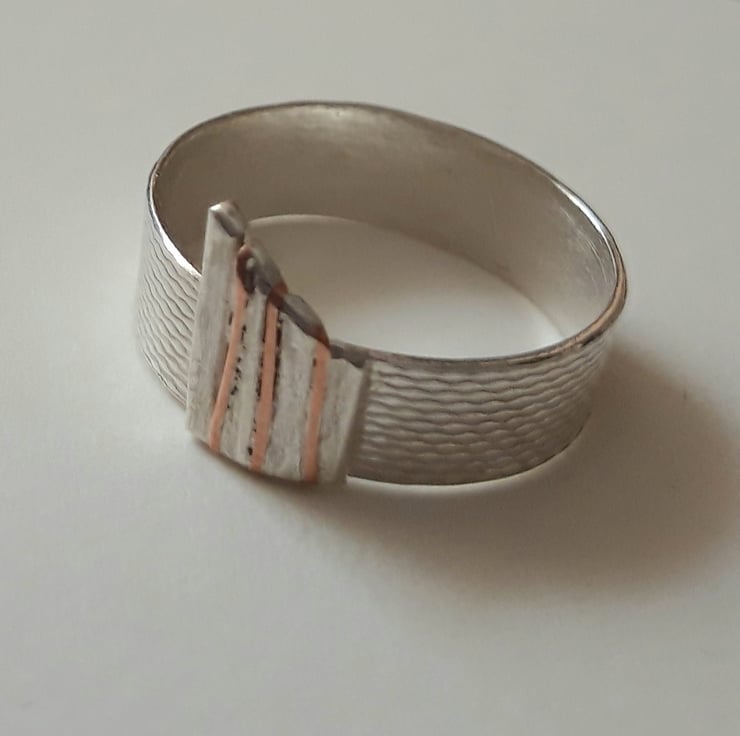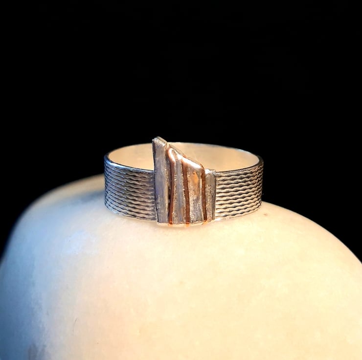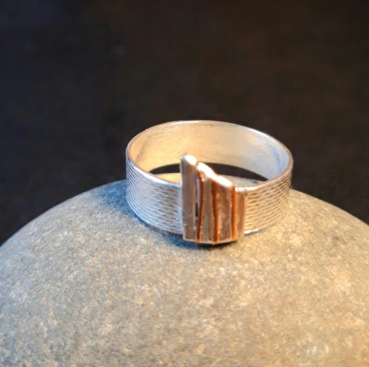 This silver ring is made from textured silver from a 1950s cigarette case and features a silver and copper striped 'fence' at the front. It is a lovely one off piece - UK size N.